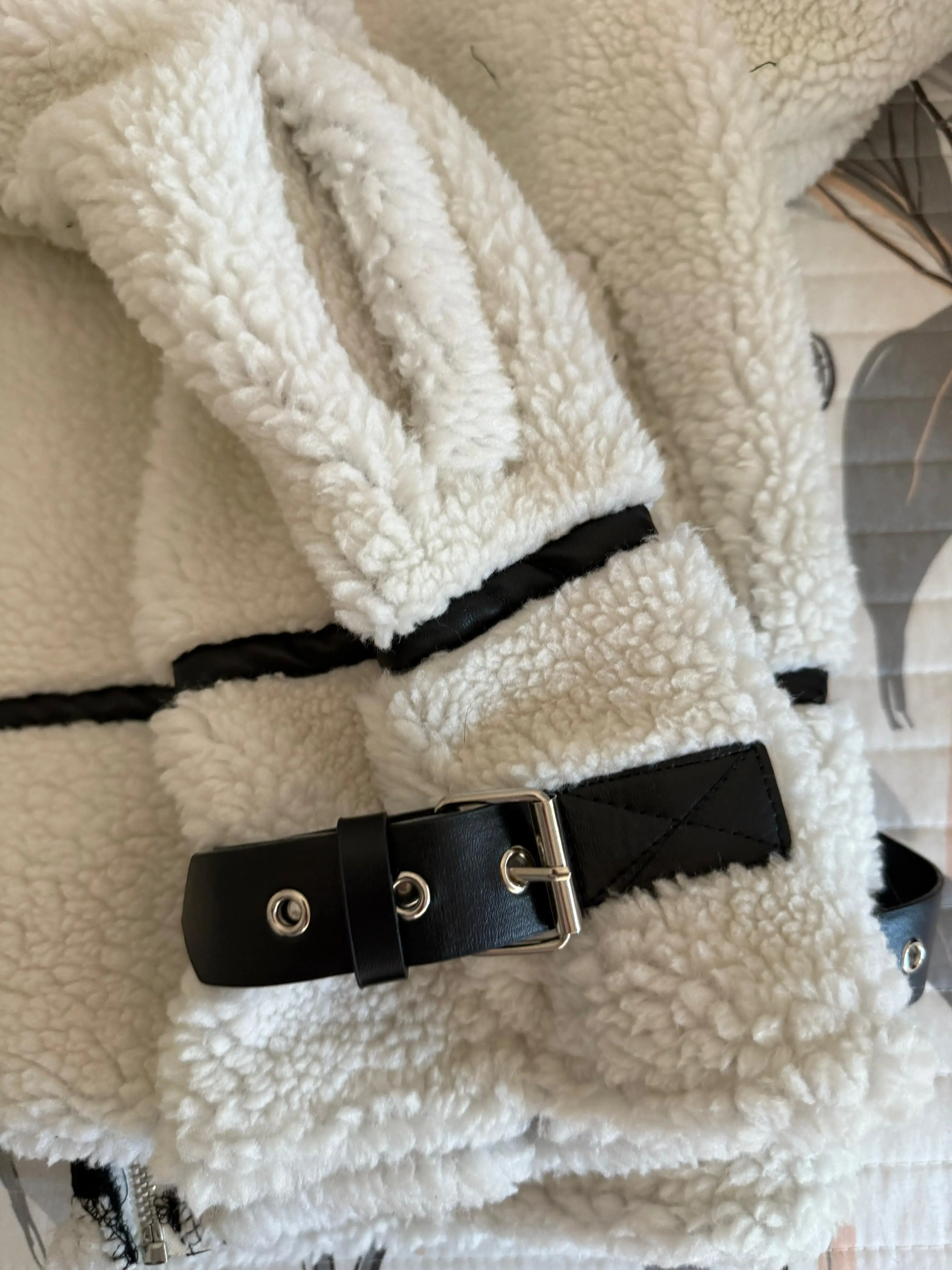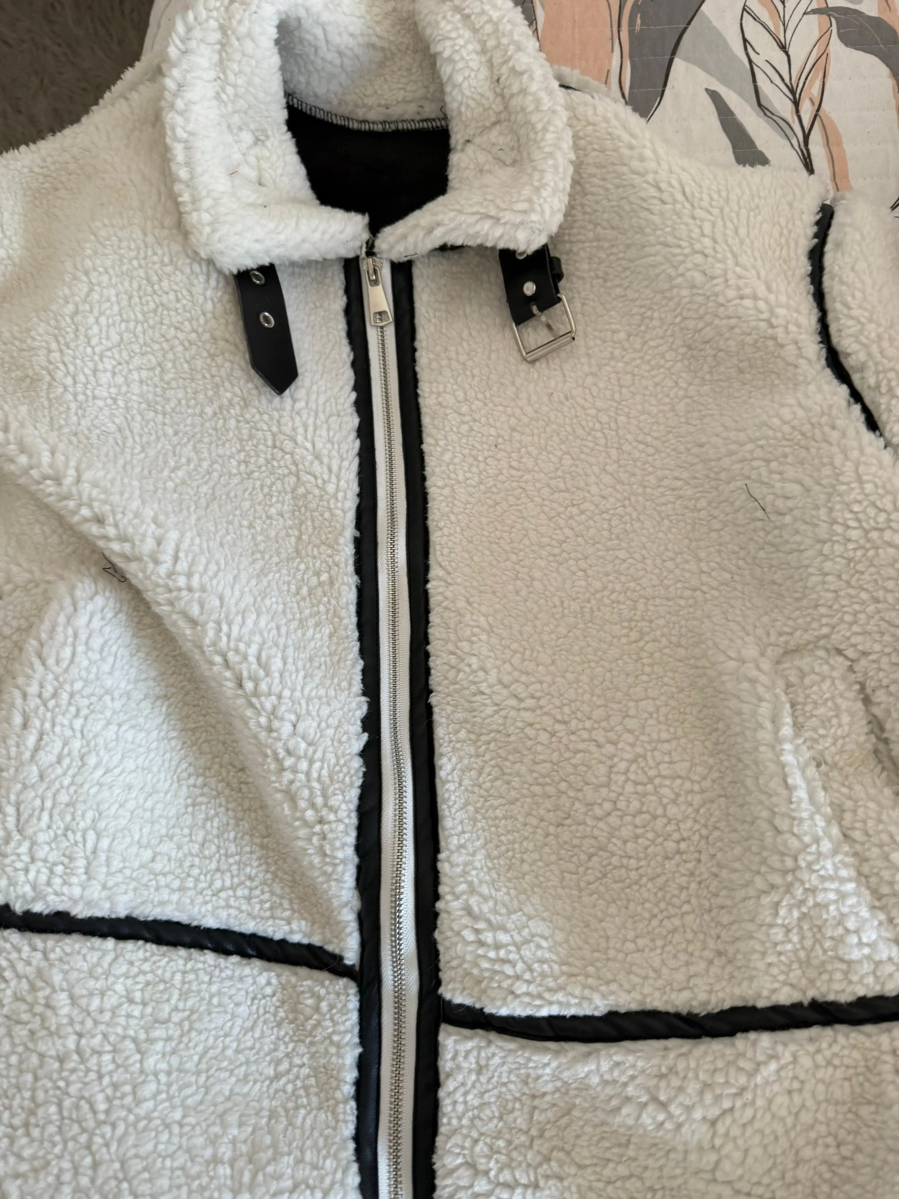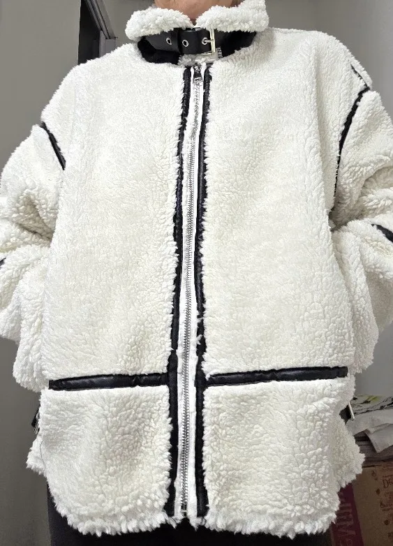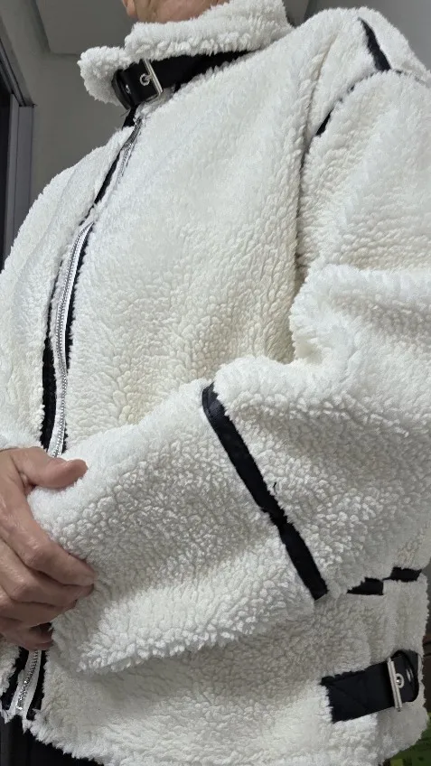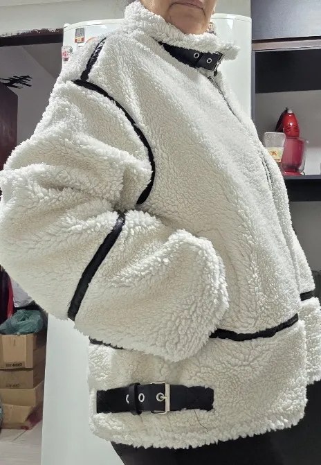 This jacket is beautiful. The lamb-type plush material is very soft and provides a lot of warmth. I loved the contrast with the black details, especially on the edges and the closure, which give it a modern and stylish look. The high collar with buckles is a great detail that also provides good protection from the cold. The jacket arrived in good condition, without any strange smell and without defects. The size was correct, so I recommend following the seller's guide. It's comfortable, cute, and super warm!