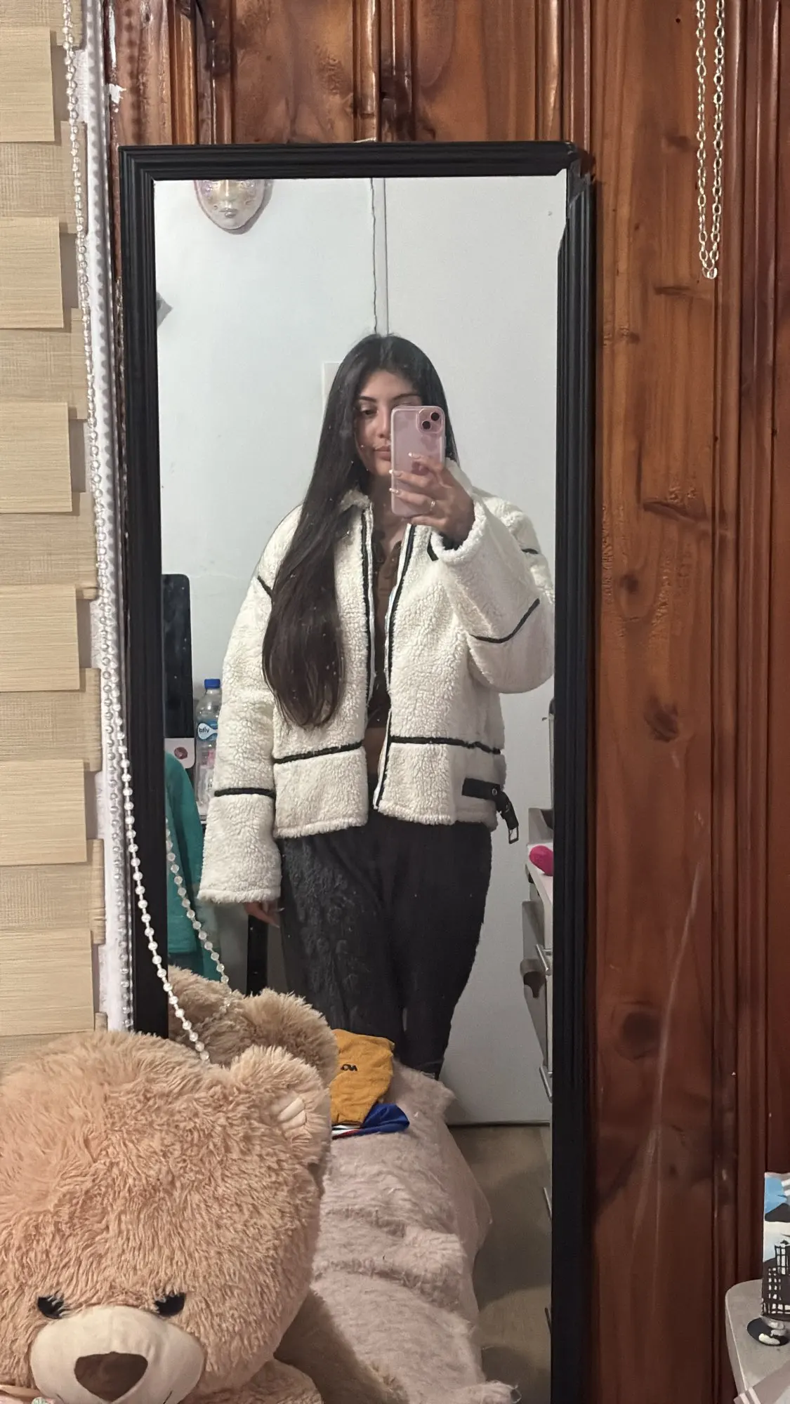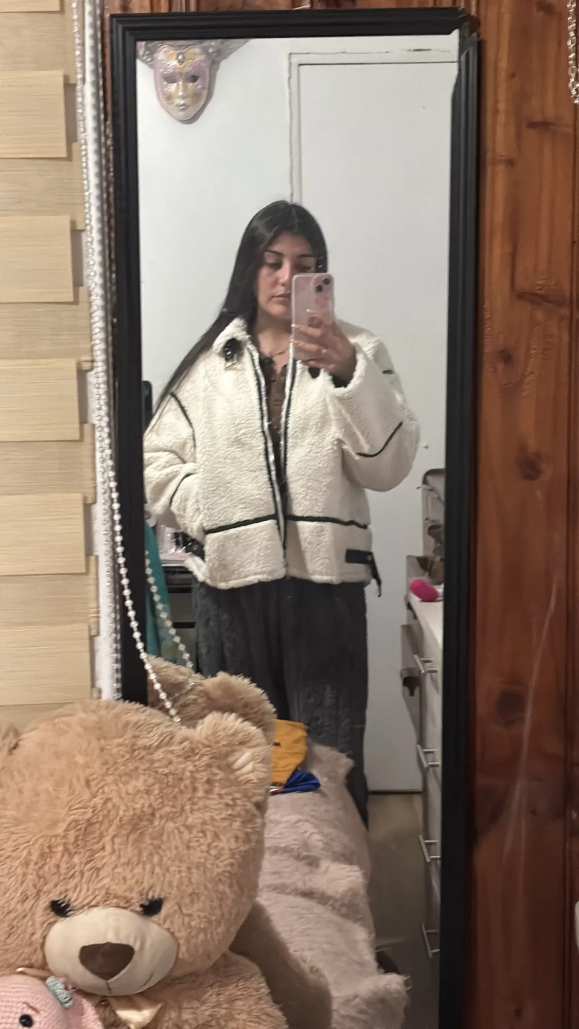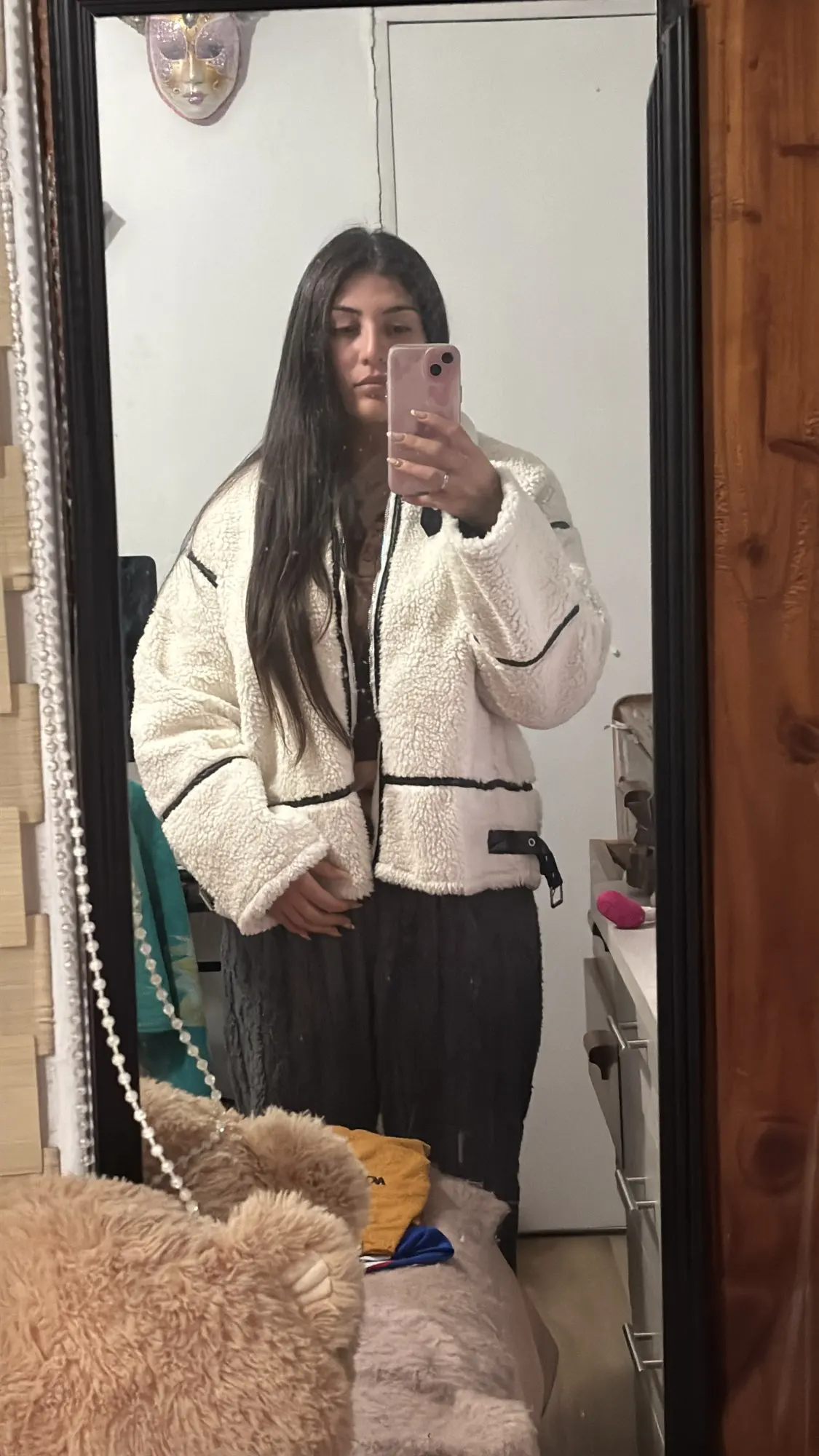 This jacket is beautiful. The lamb-type plush material is very soft and provides a lot of warmth. I loved the contrast with the black details, especially on the edges and the closure, which give it a modern and stylish look. The high collar with buckles is a great detail that also provides good protection from the cold. The jacket arrived in good condition, without any strange smell and without defects. The size was correct, so I recommend following the seller's guide. It's comfortable, cute, and super warm!