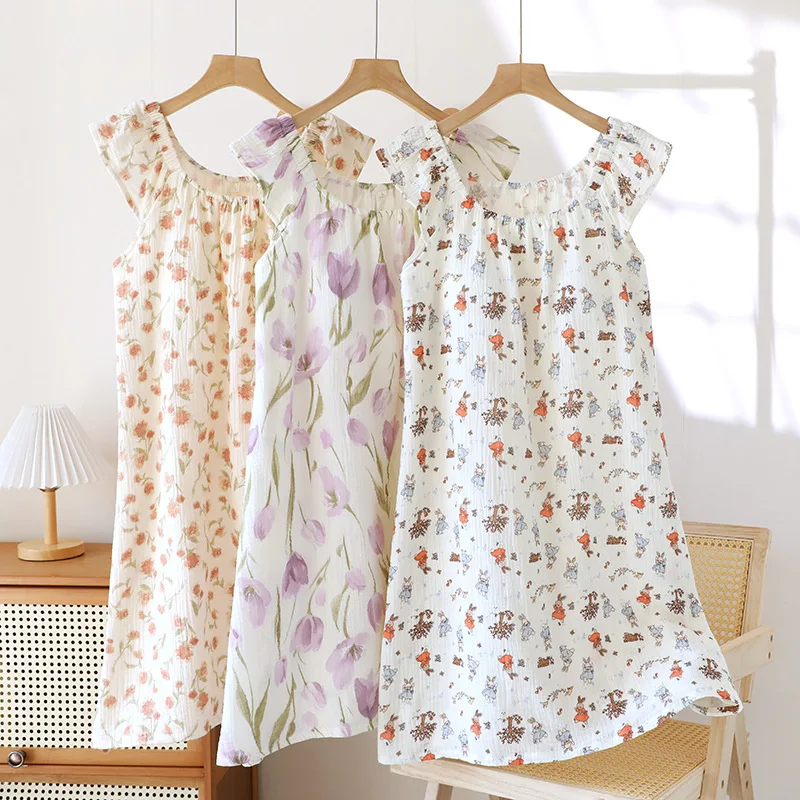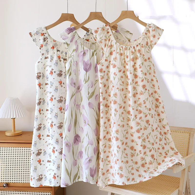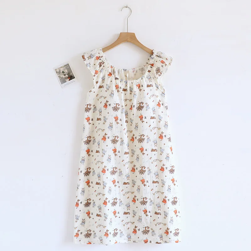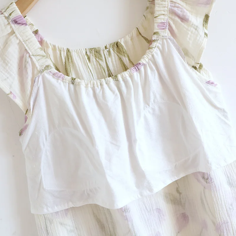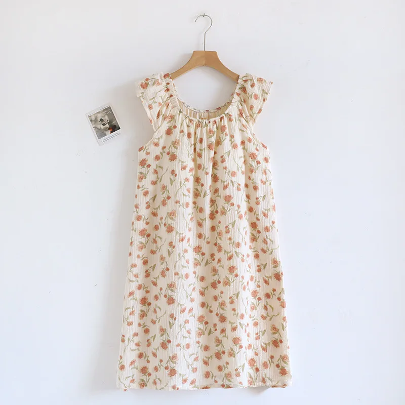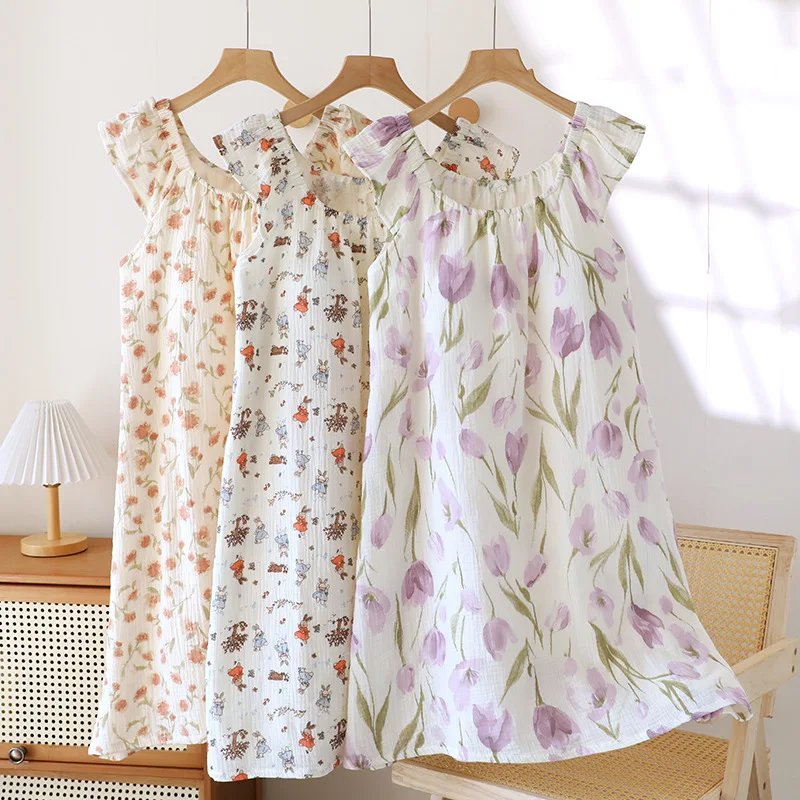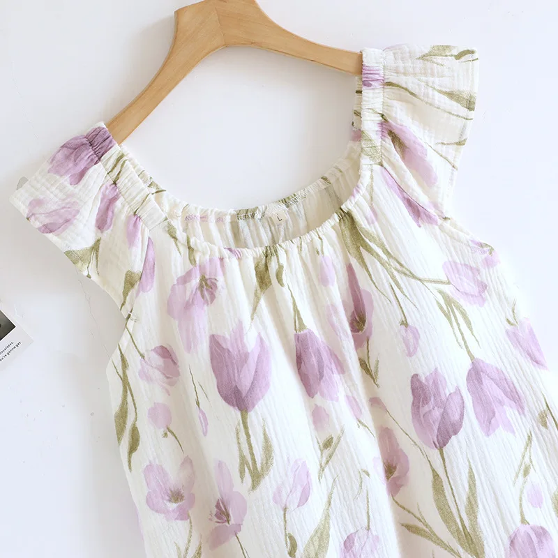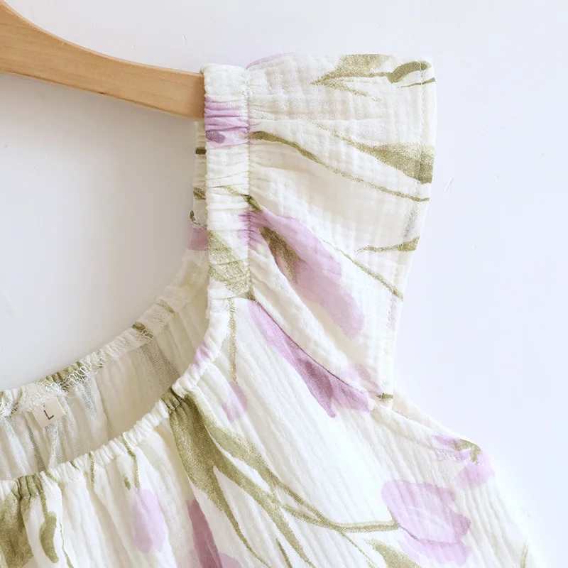 Adorable 2025 summer nightgown crafted from 100% cotton crepe fabric for ultimate breathability and comfort. Features a cute tank top design with built-in chest cushioning and loose-fitting knee-length skirt. The sleeveless crew neck style with charming floral print creates a funny and cute look perfect for home lounging and sleep during warm summer nights.