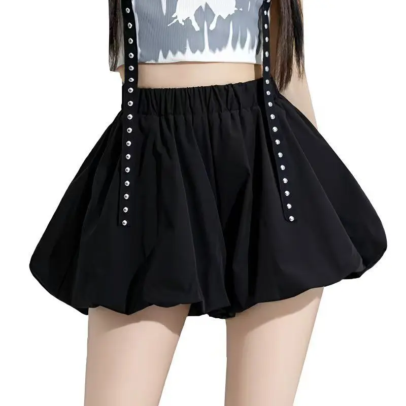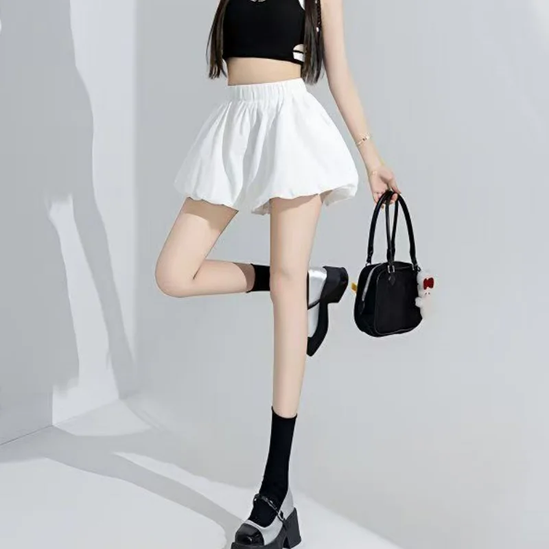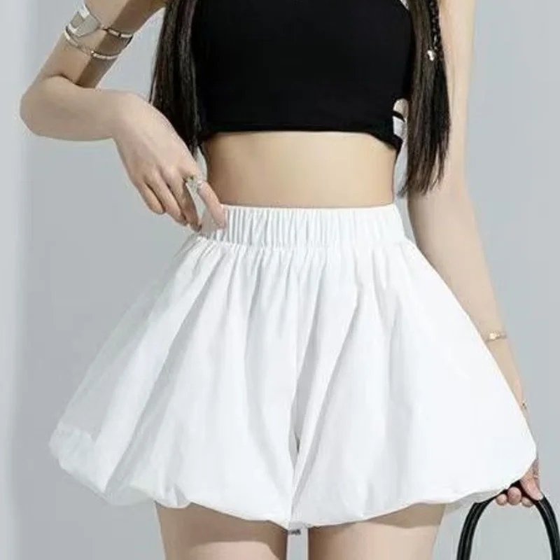 Playful, puffed bloomers-style shorts with a comfy elastic mid-rise waist that stretches about 12 inches for an easy, loose fit. Made from a soft blended fabric with side pockets for casual Korean-chic streetwear in spring and summer. Note: The white color is slightly translucent; pair with white or light underwear.