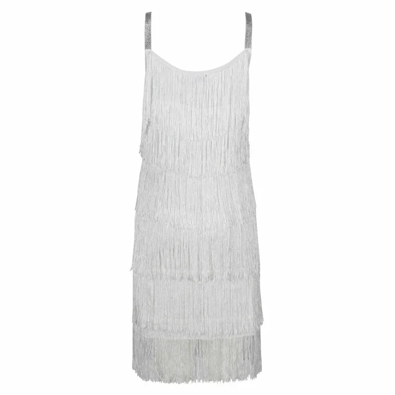 Chic and sexy sleeveless dress featuring elegant tassel detailing inspired by the Great Gatsby era. Perfect for cocktail parties, dance performances, and themed events. The luxurious design captures 1920s glamour with modern sophistication.