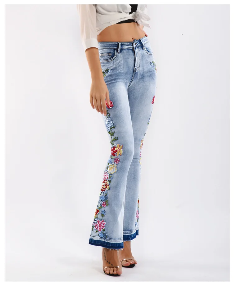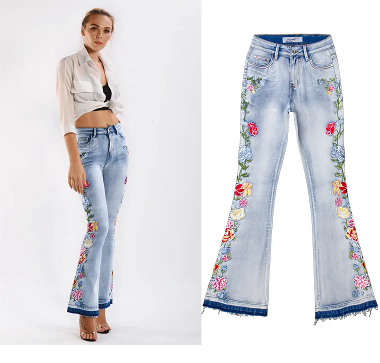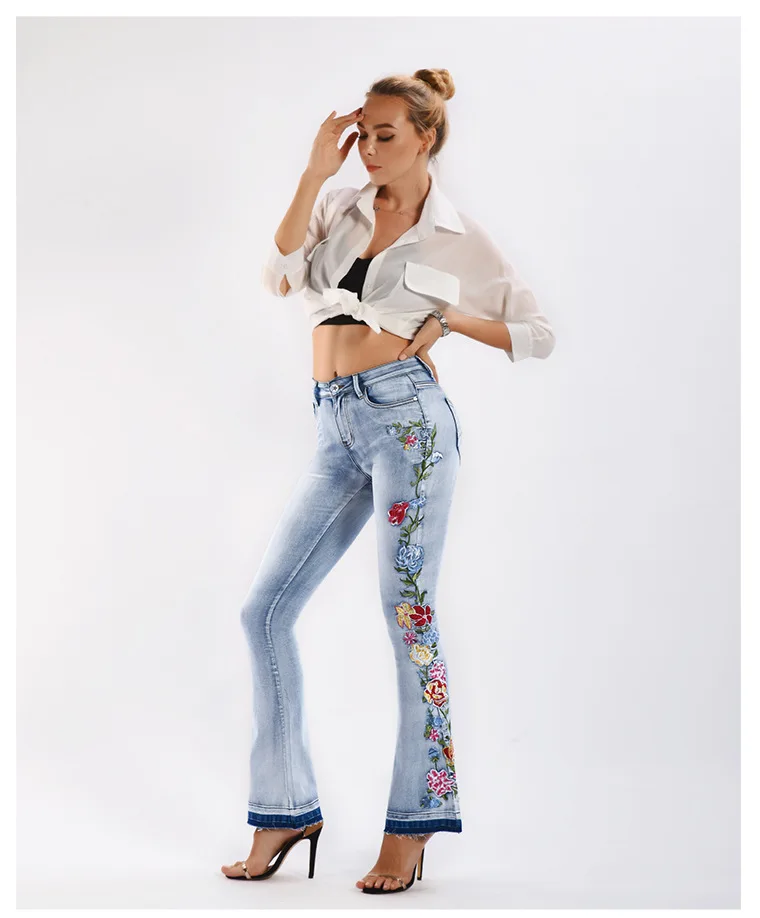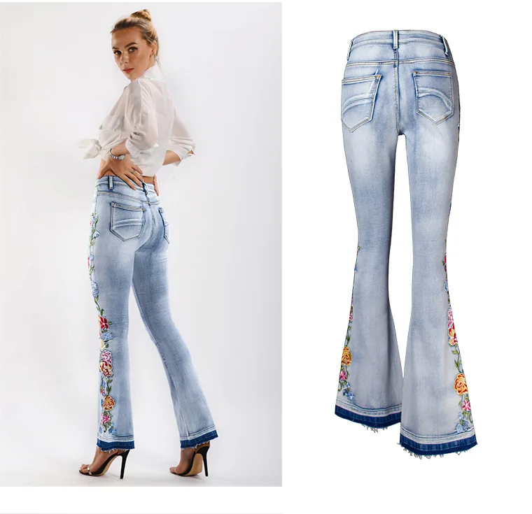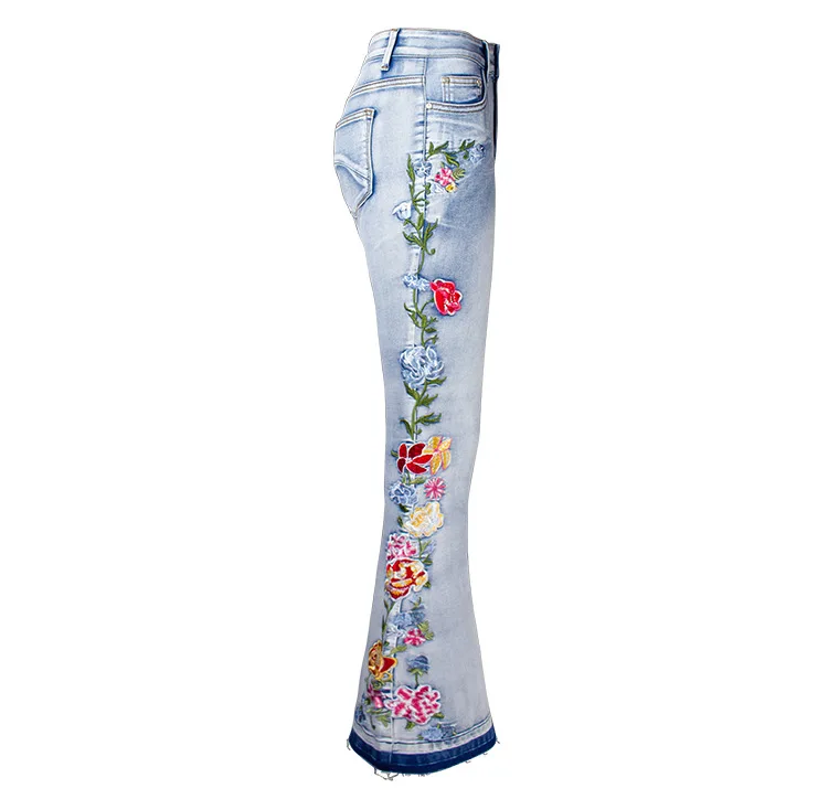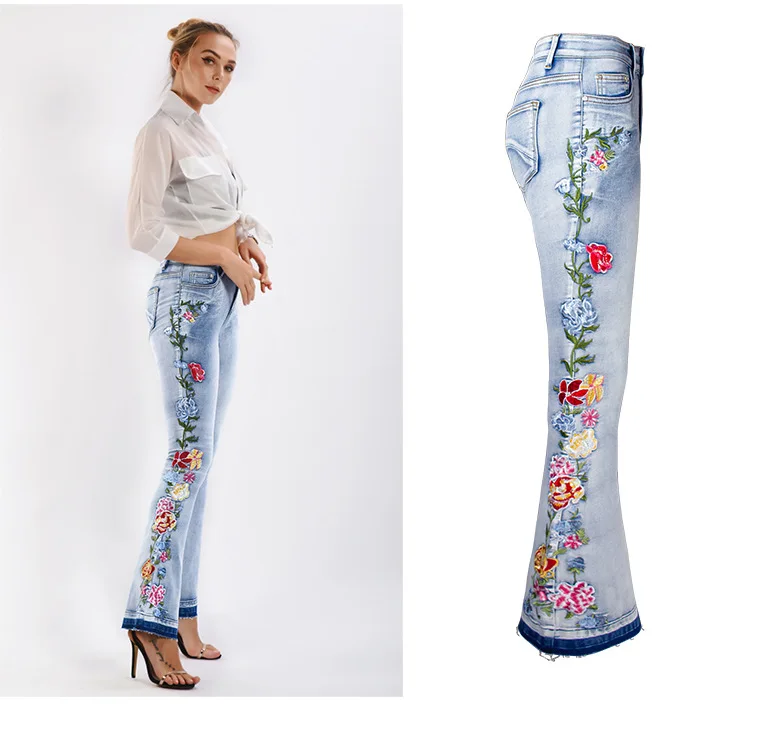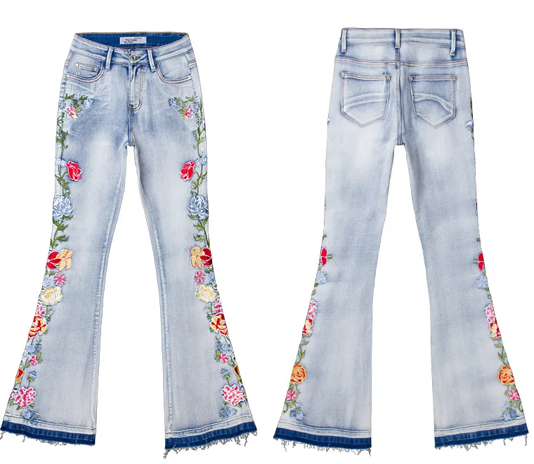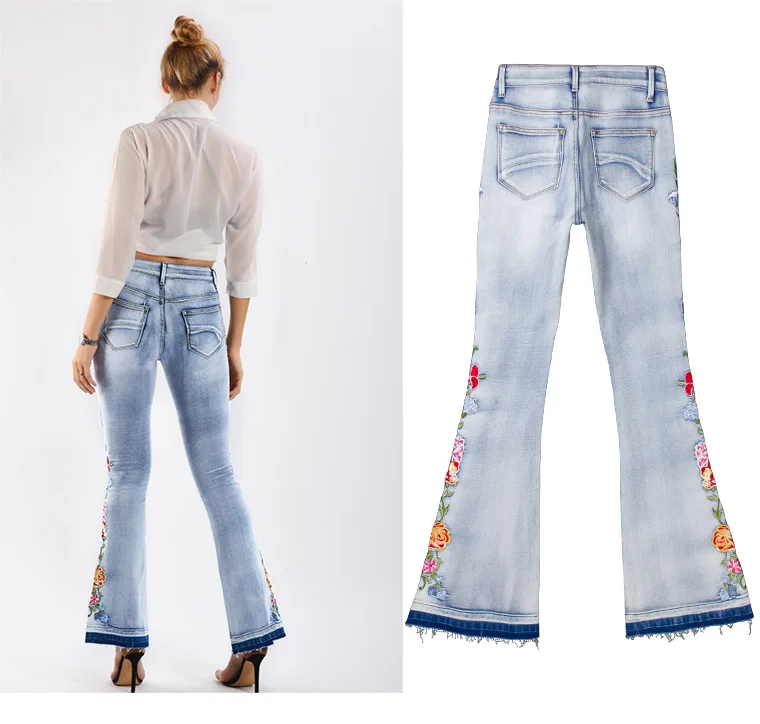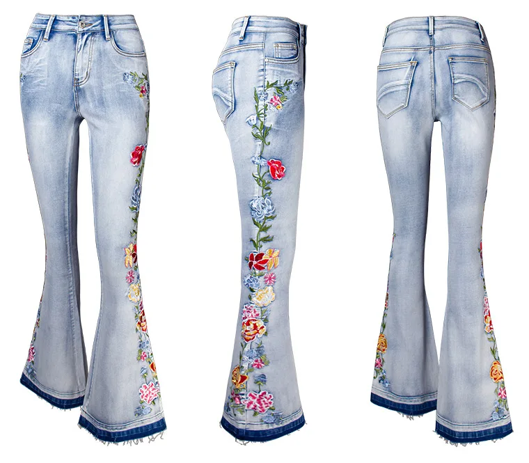 Elevate your style with these trendy vintage-inspired flare jeans featuring beautiful embroidered floral details. Designed with a flattering push-up fit and mid-waist silhouette, these versatile denim pants offer comfort and style for any season. Perfect for creating that retro-chic look with modern comfort.