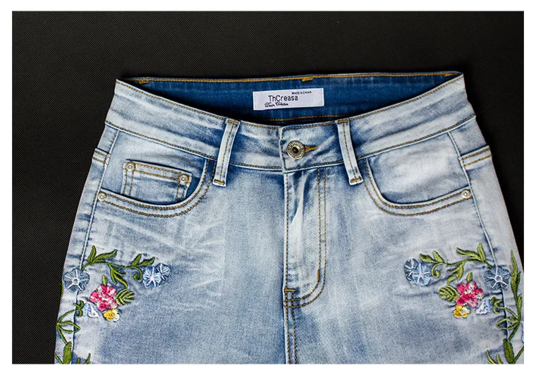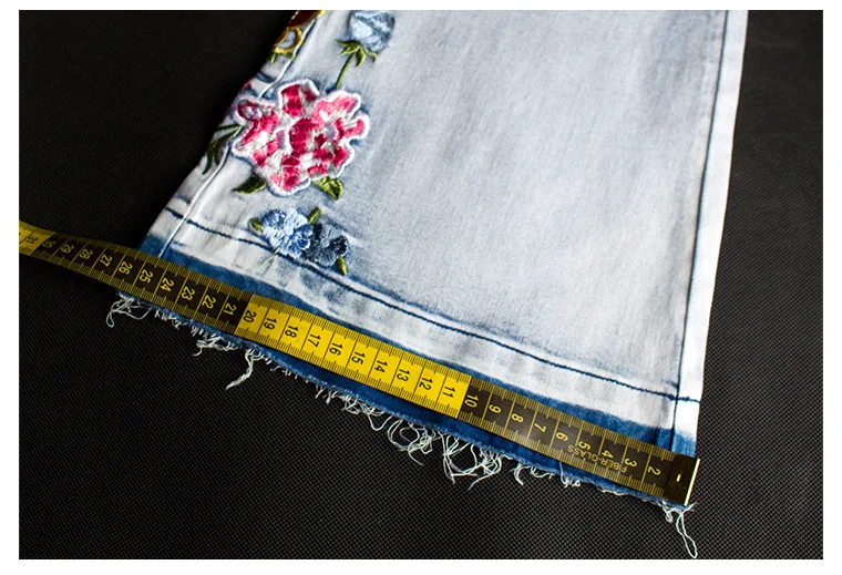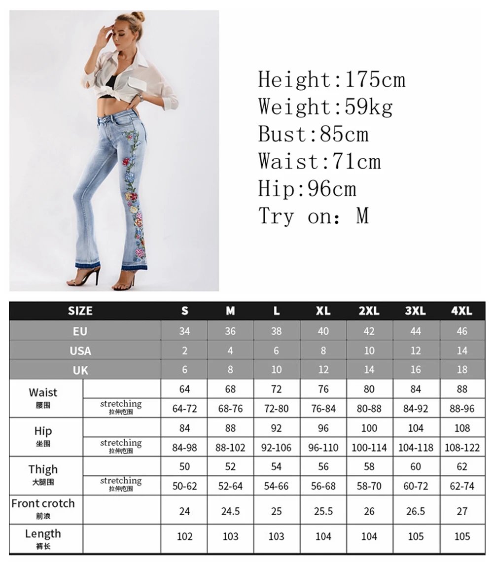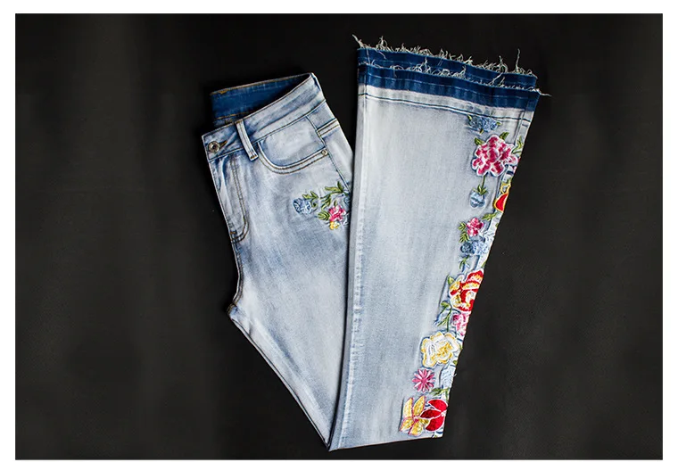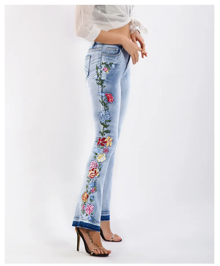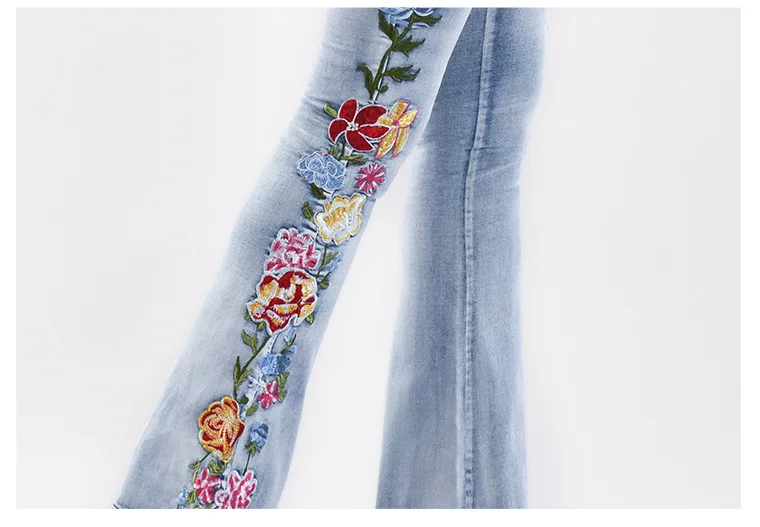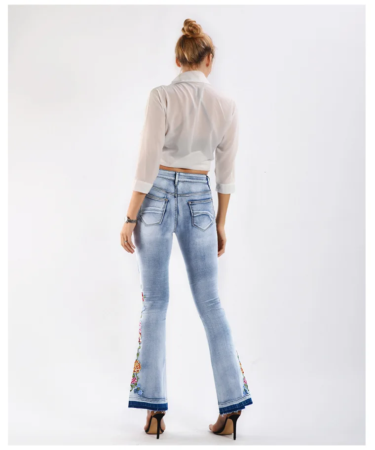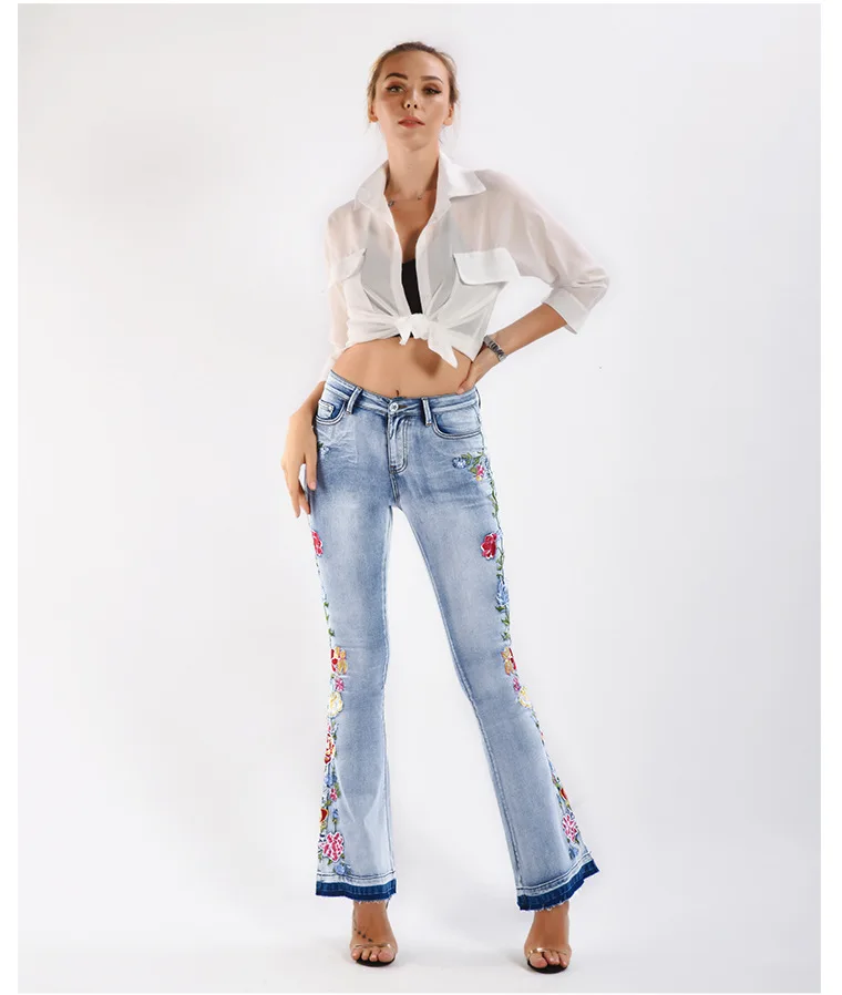 Elevate your style with these trendy vintage-inspired flare jeans featuring beautiful embroidered floral details. Designed with a flattering push-up fit and mid-waist silhouette, these versatile denim pants offer comfort and style for any season. Perfect for creating that retro-chic look with modern comfort.