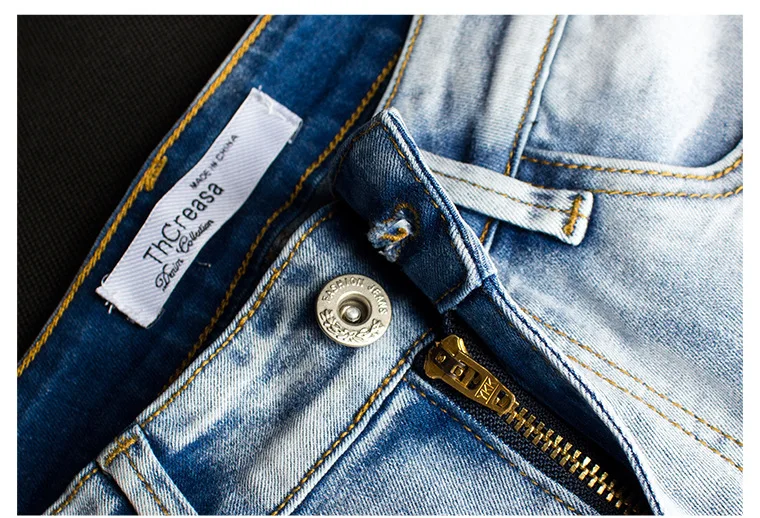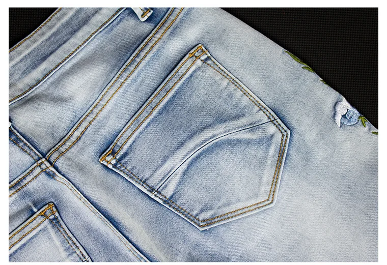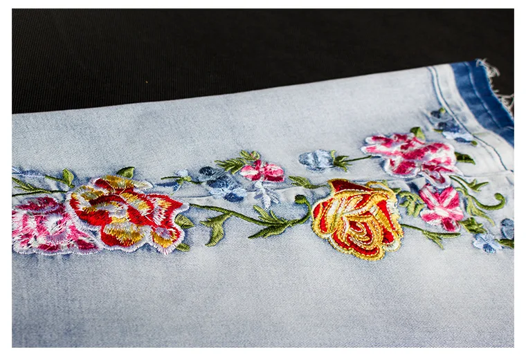 - Color: Light wash denim with embroidery