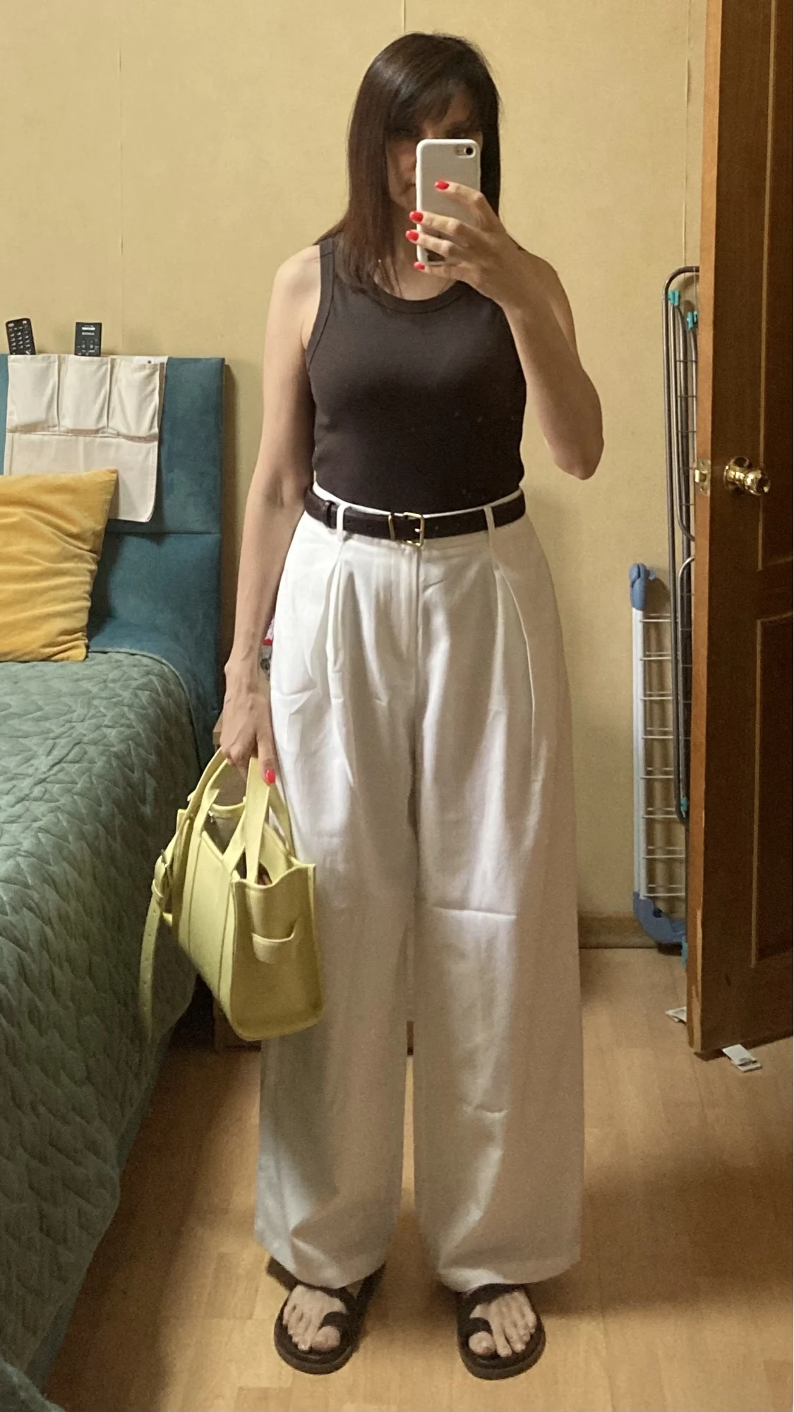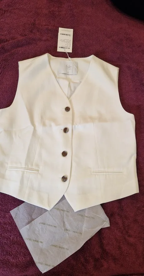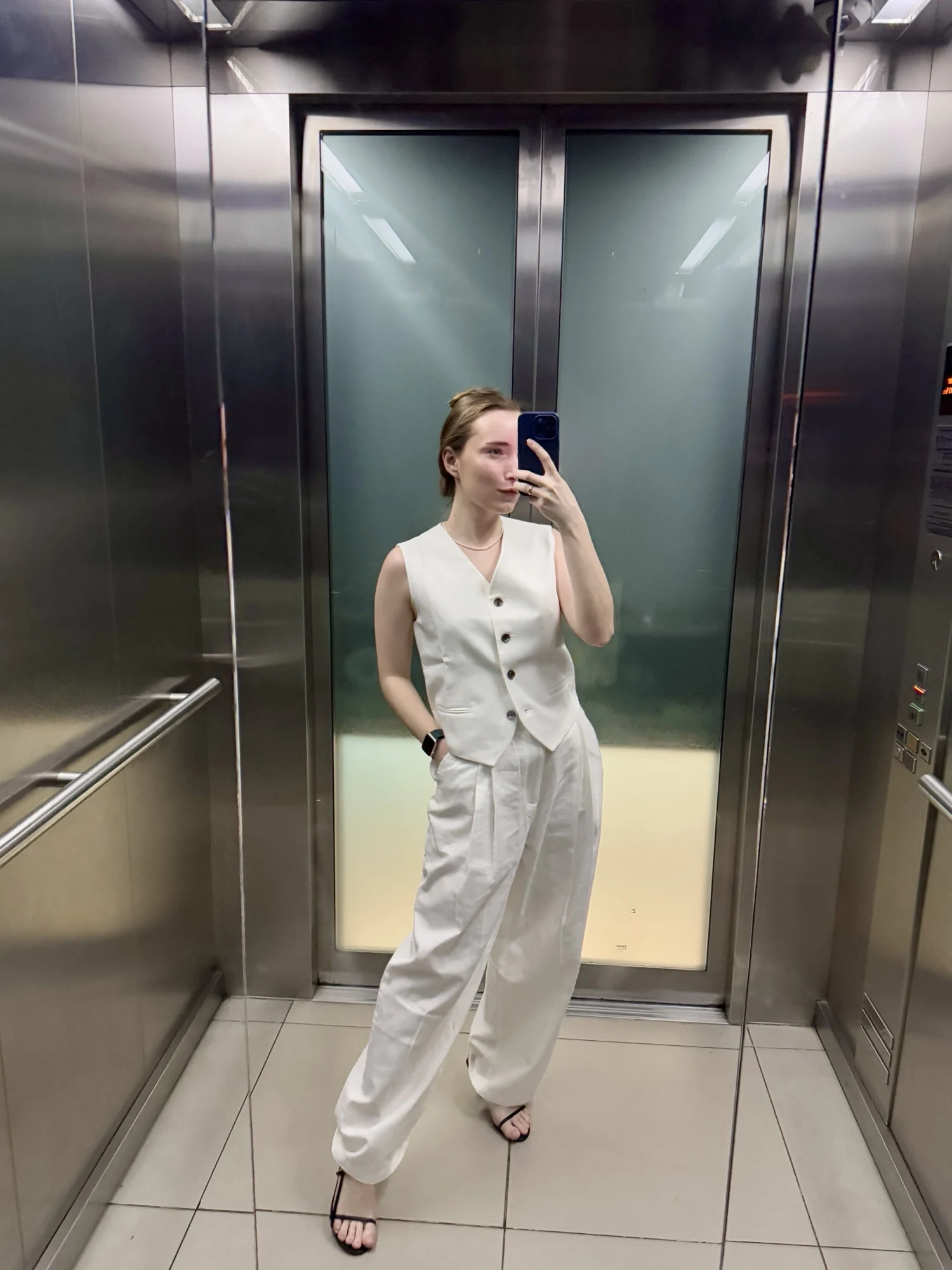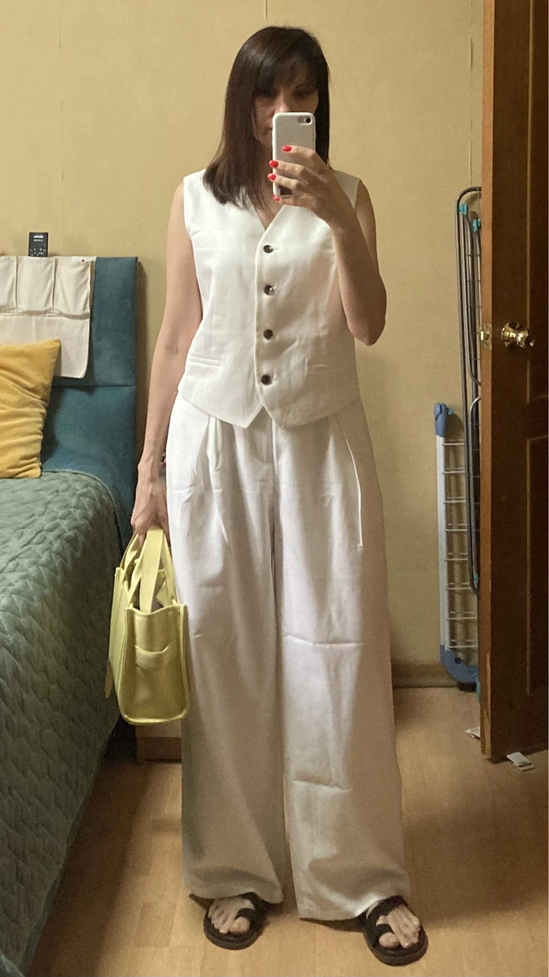 Sophisticated 2025 vintage-inspired two-piece set featuring a sleeveless V-neck vest paired with high-waist wide-leg pants with adjustable waistband. Crafted from an eco-friendly linen blend, this old money style suit transitions seamlessly from boardroom meetings to brunch gatherings. The straight-fit tailoring and button fly closure create a timeless, professional silhouette perfect for middle-aged women seeking elegant office wear.