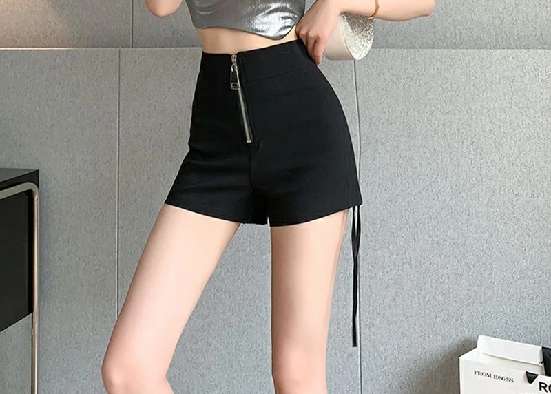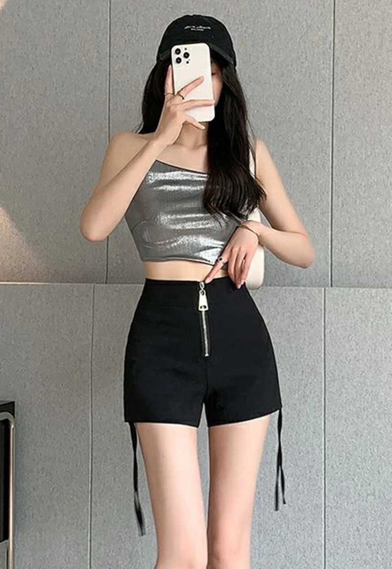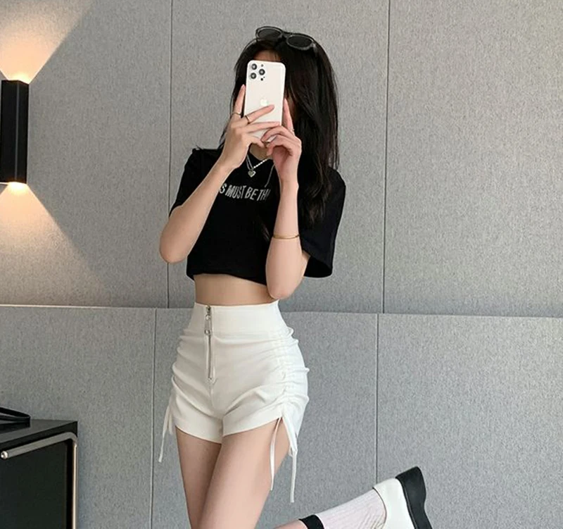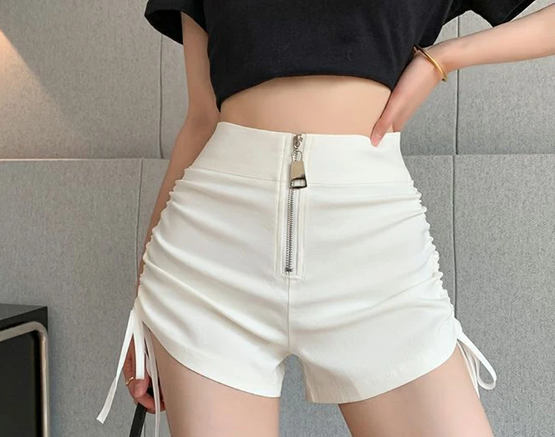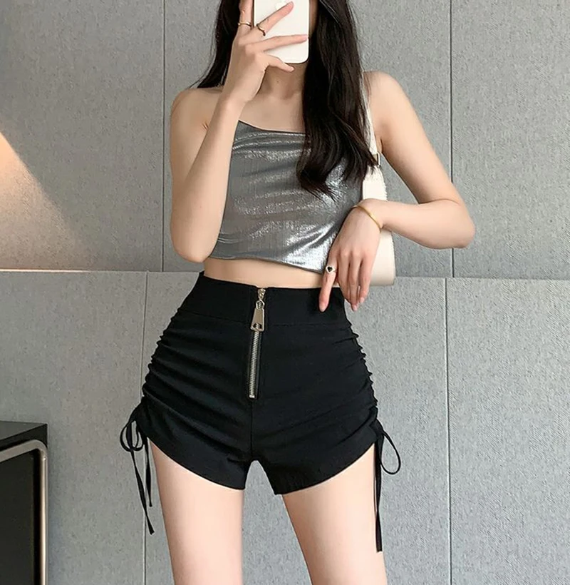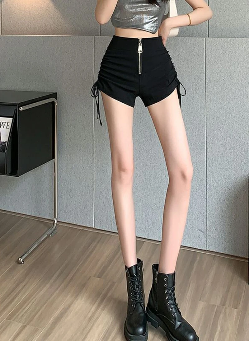 These sleek, high-rise slim-fit shorts feature an elastic waistband with lace-up detailing, zipper accents, and subtle shirring for a bold high-street look. Perfect for summer yoga, running, and everyday sporty streetwear.