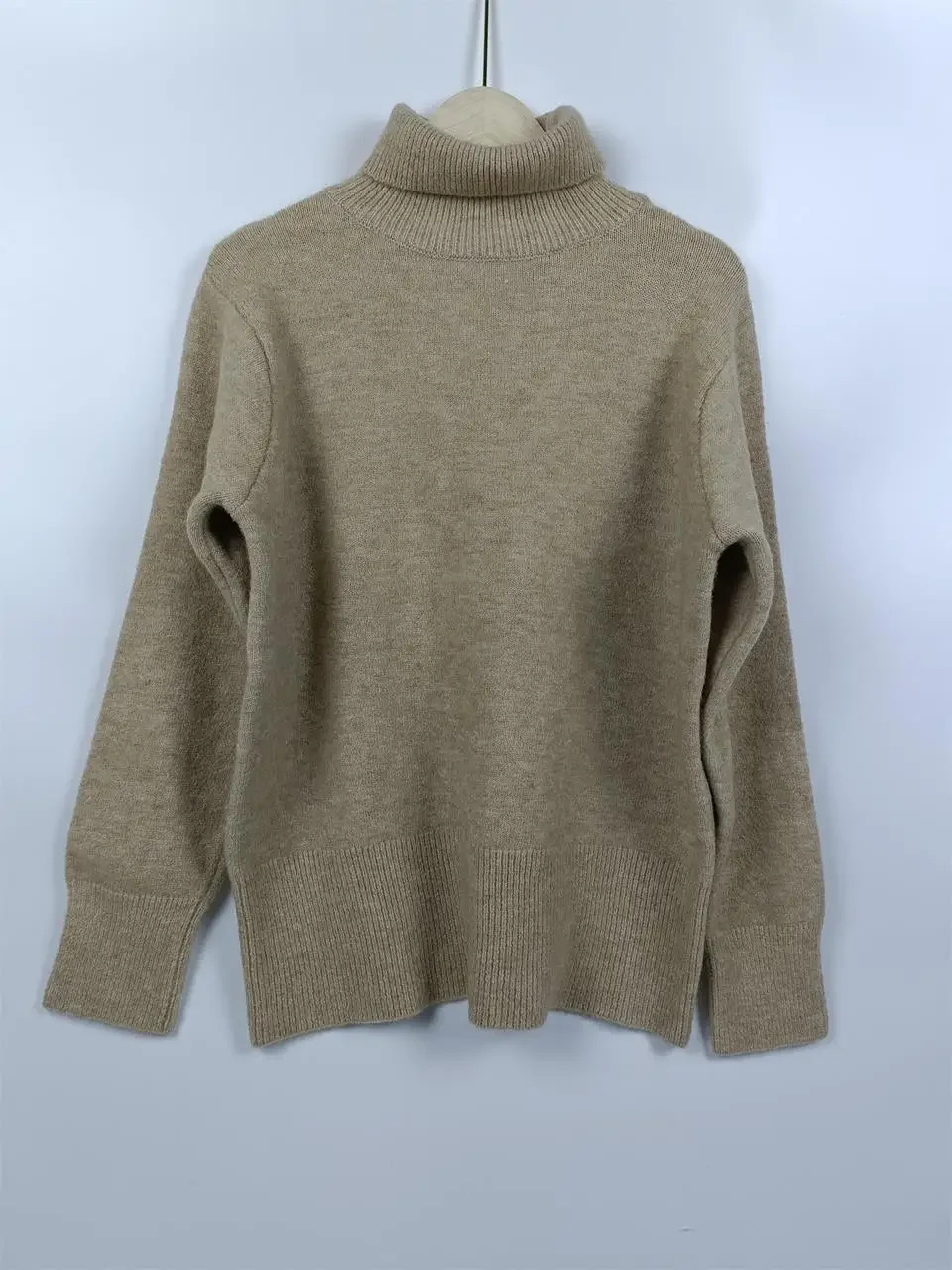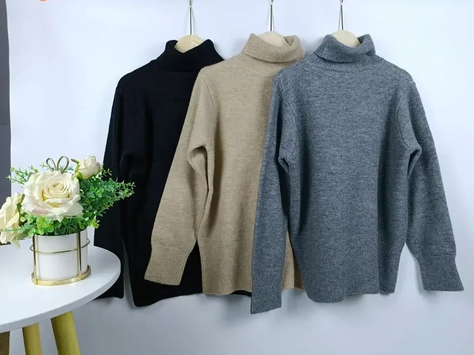 The high turtleneck collar provides both warmth and style, creating a flattering frame for your face while offering protection from cool weather. The loose-fitting cut ensures comfortable wear throughout the day, making it perfect for both professional settings and casual weekend adventures.