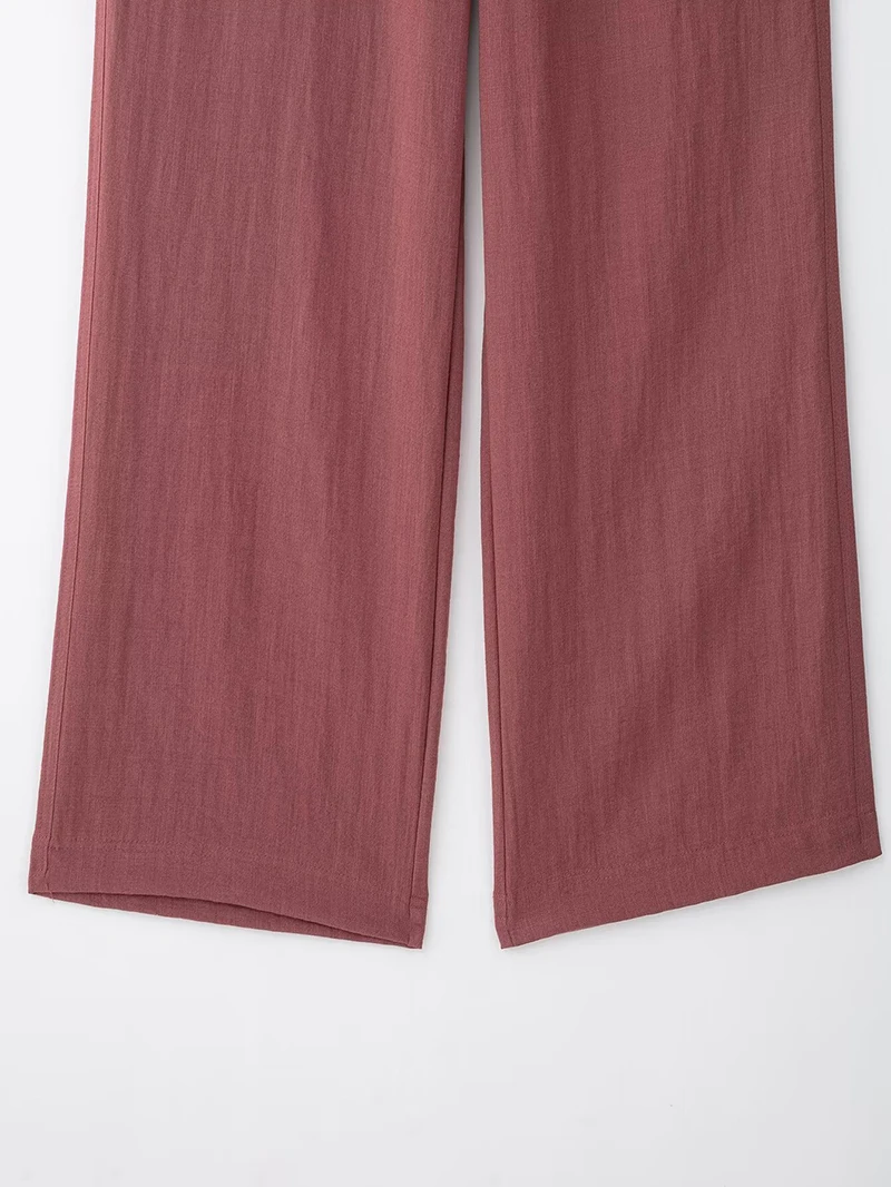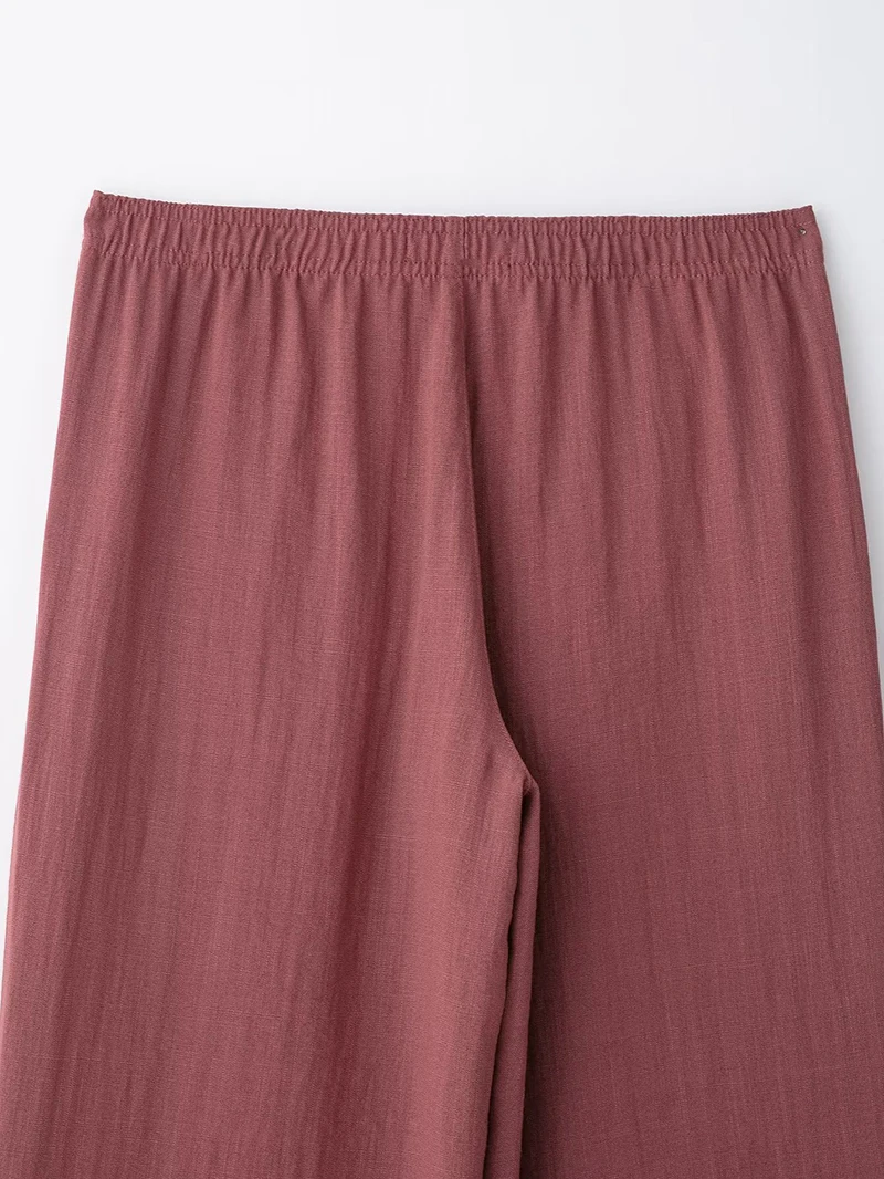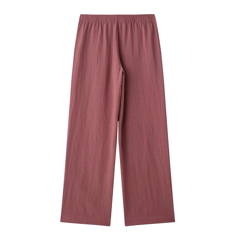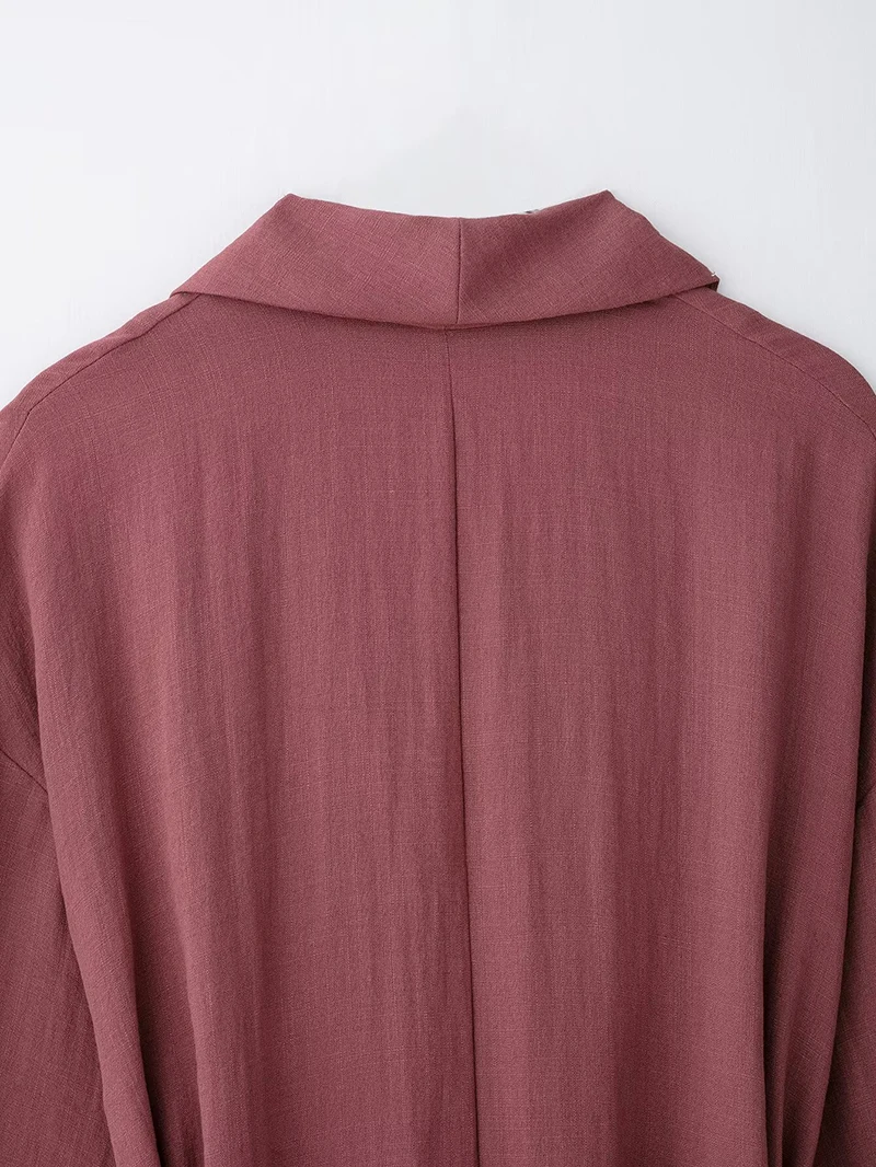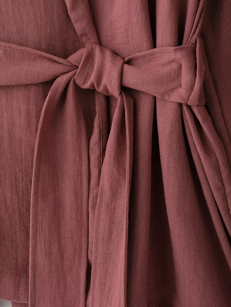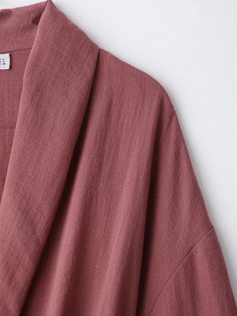 A stylish vintage-inspired two-piece outfit featuring a loose-fitting long sleeve kimono coat with turn-down collar and mid-waist flare pants. This comfortable spring/summer set includes a matching belt and elastic waist for easy wear. Perfect for middle-aged women seeking a relaxed yet fashionable look with full-length coverage.
