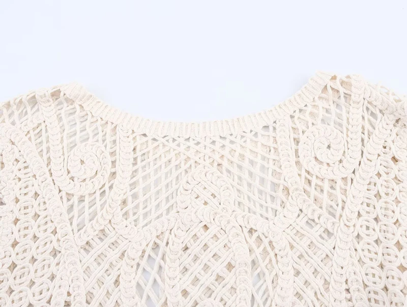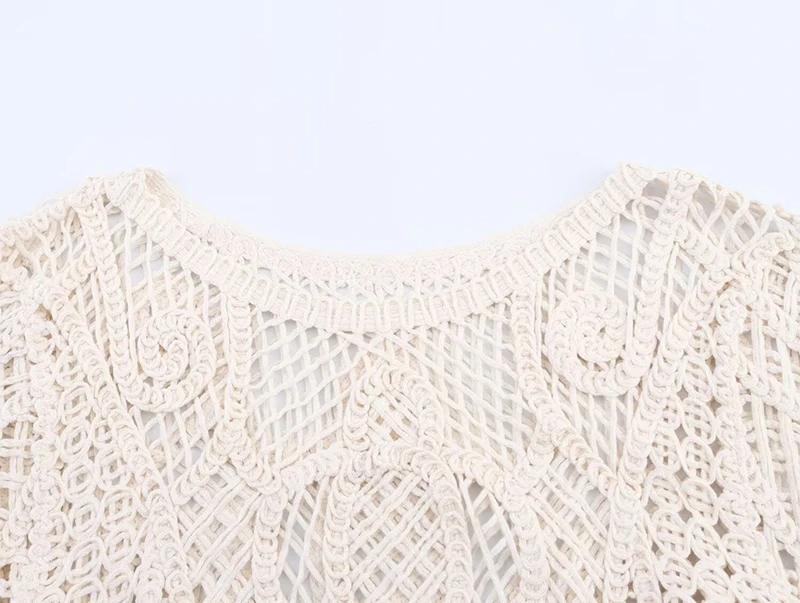 This chic crochet knit sweater features stylish hollow out detailing perfect for spring and summer occasions. Designed with a classic O-neck and regular fit, this short pullover top adds a fashionable touch to party outfits and carnival festivities. The lightweight polyester construction makes it ideal for warmer weather styling.