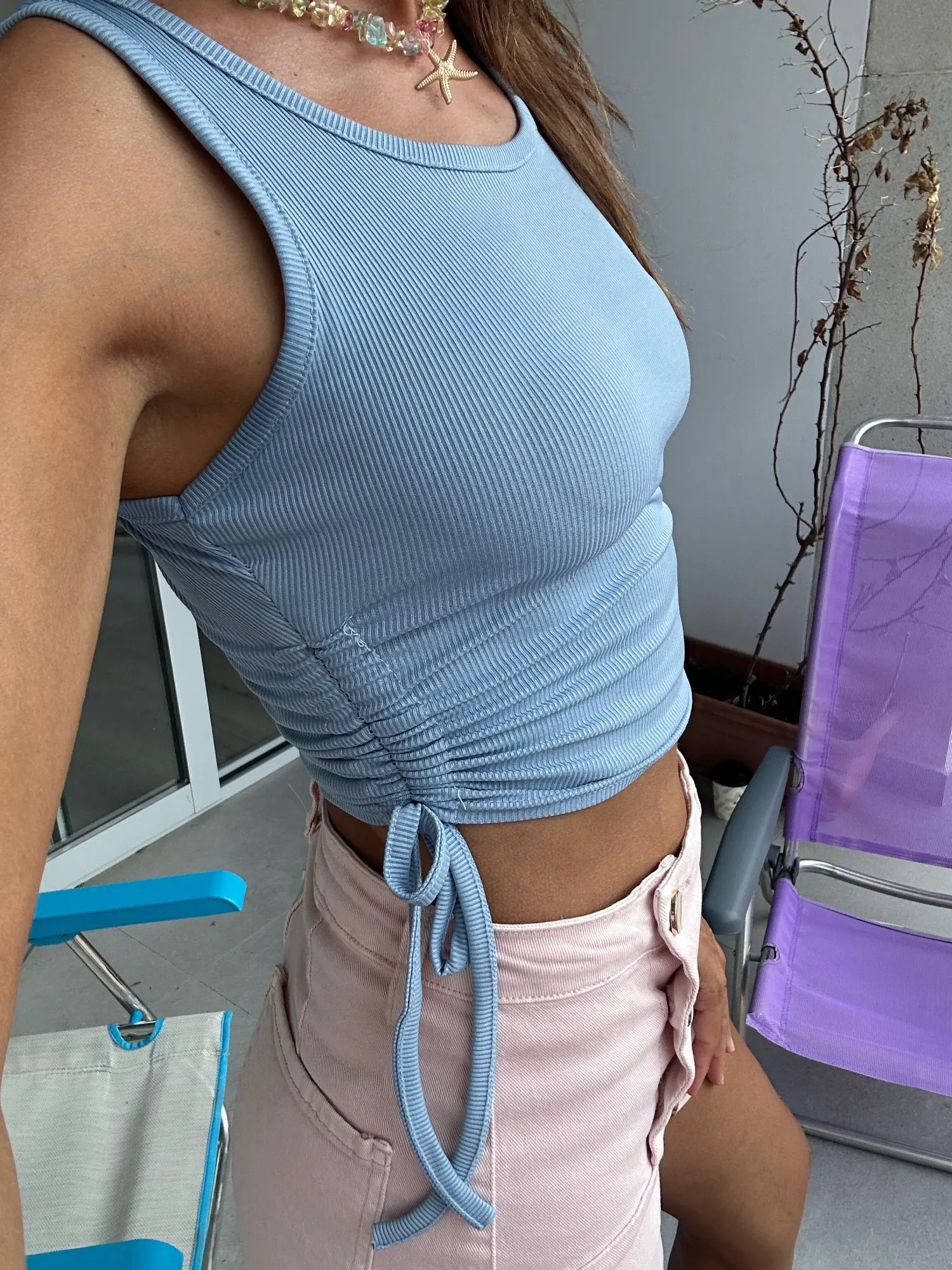 Women's Ruched Sleeveless Crop Tank Top with Tie-Up Detail photo review
