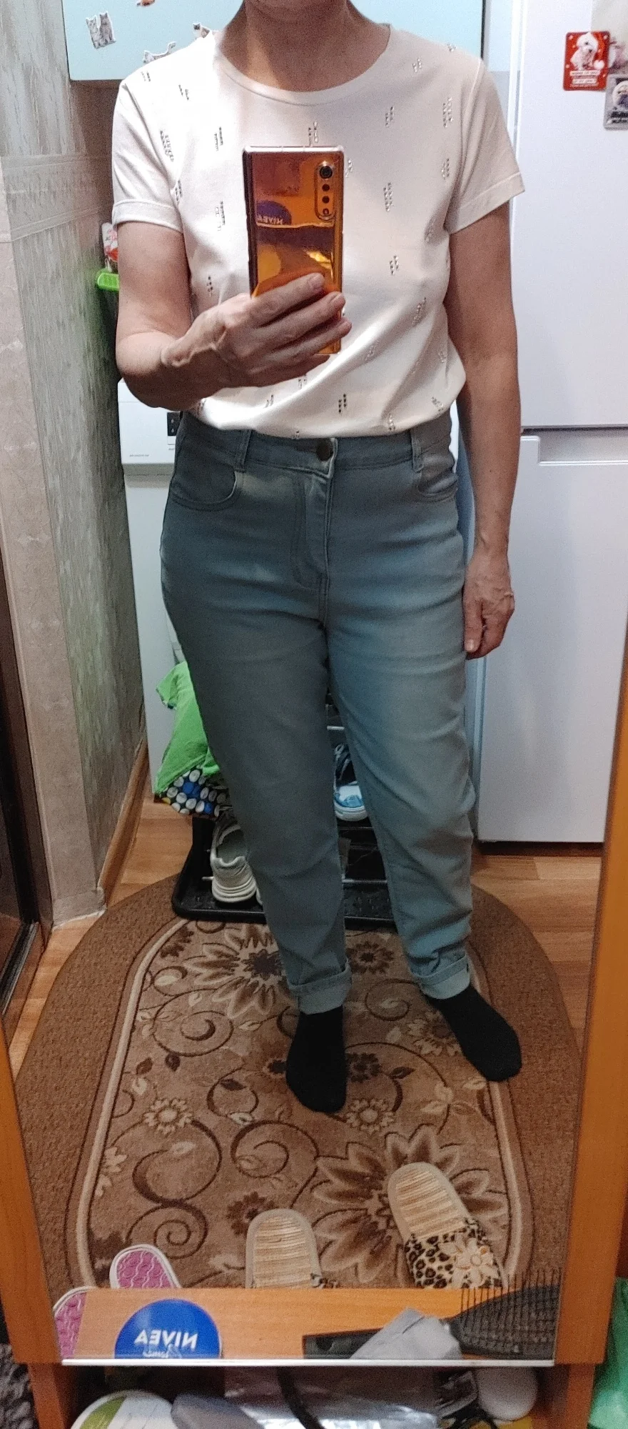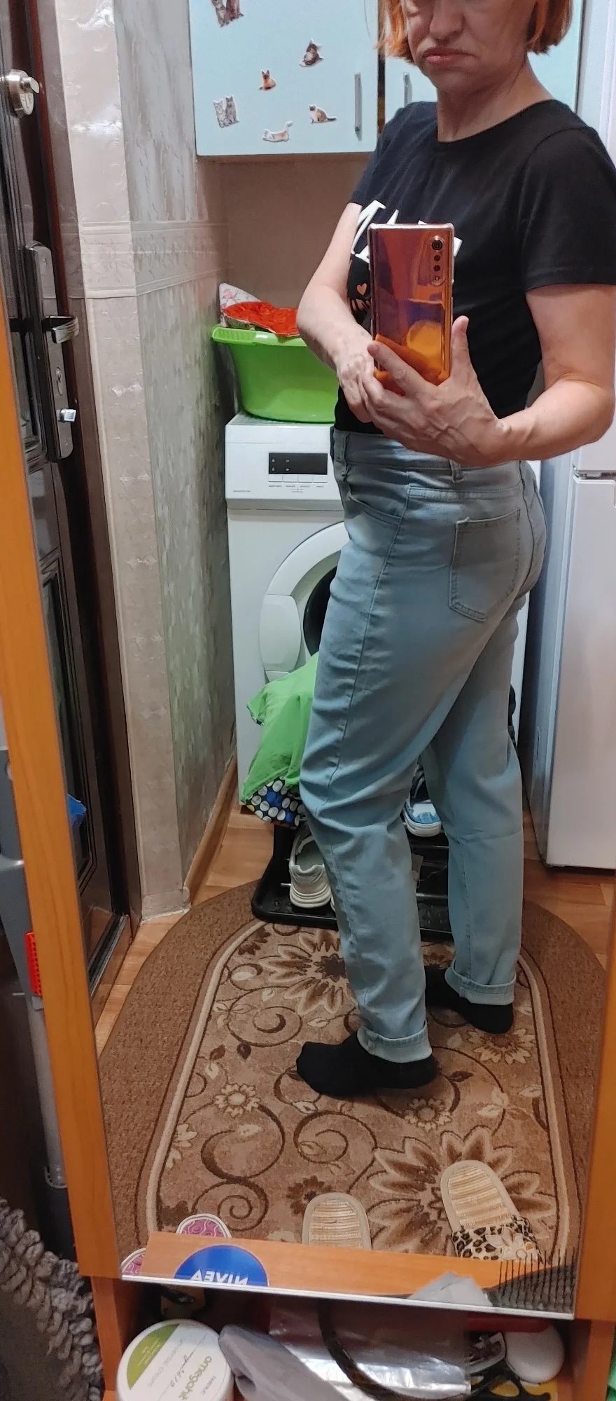 The jeans are not bad. High rise, fabric as stated. But, I want to note that these are not skinny at all - yes, they are not wide, but they are not so narrow to match this name. They stretch very little, the fabric is not very elastic. The size corresponds to the size chart.