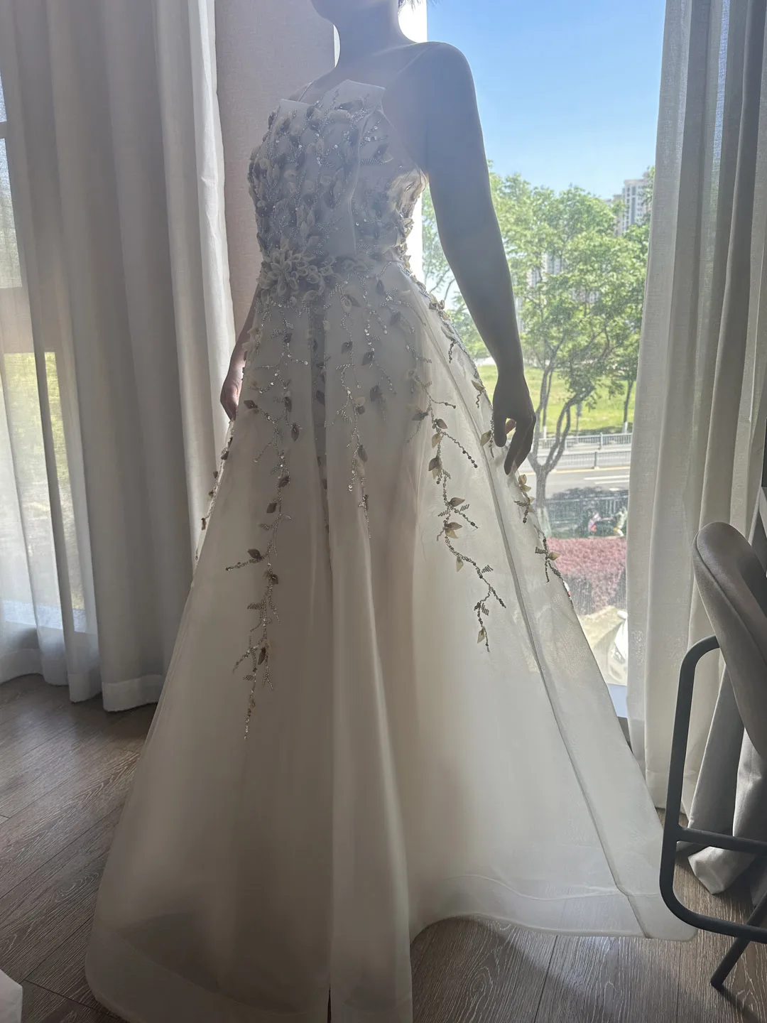 3D Floral Embroidery: Hand-crafted dimensional flowers create stunning visual depth and texture Beading & Crystals: Strategically placed embellishments add sparkle and luxury appeal Sweep Train: Graceful train length perfect for formal photography and elegant movement Strapless Design: Classic neckline that showcases jewelry and creates an elongated silhouette