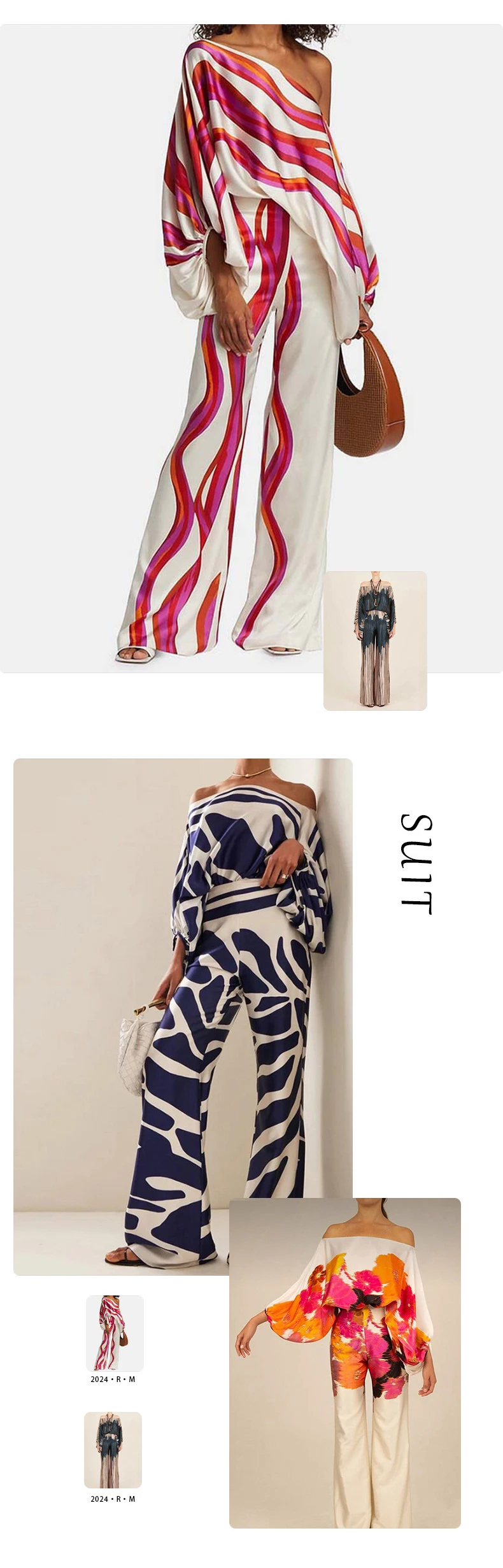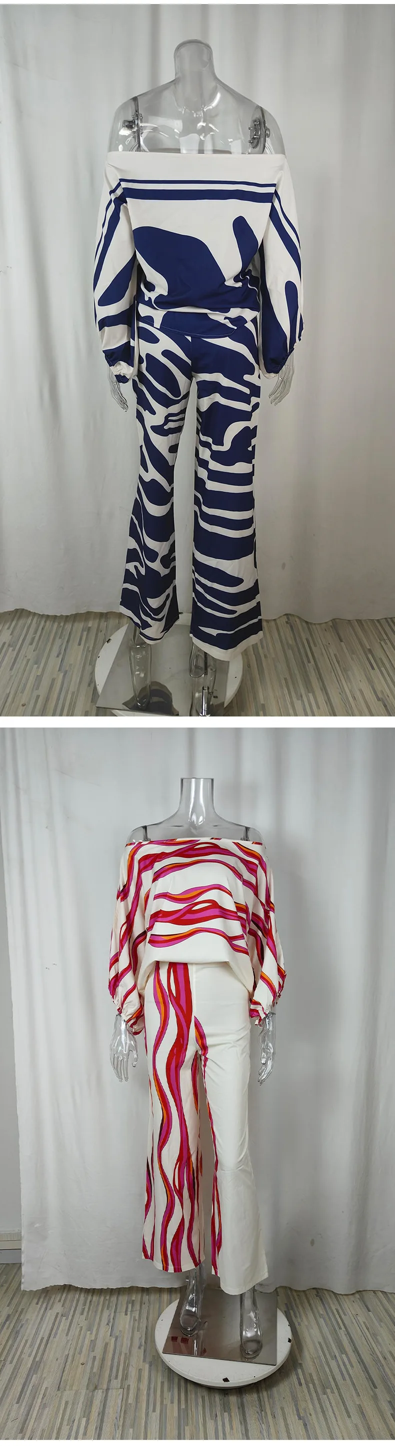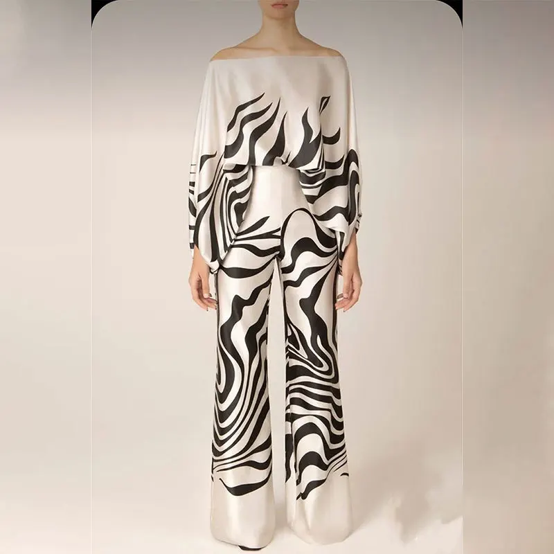 A trendy 2025 spring streetwear collection featuring a loose-fit slash neck top with batwing sleeves paired with high waist straight wide leg pants. This synthetic fiber set offers a comfortable loose fit with printed details and slight stretch. The pullover design and elastic waist provide effortless style for casual spring and summer occasions.