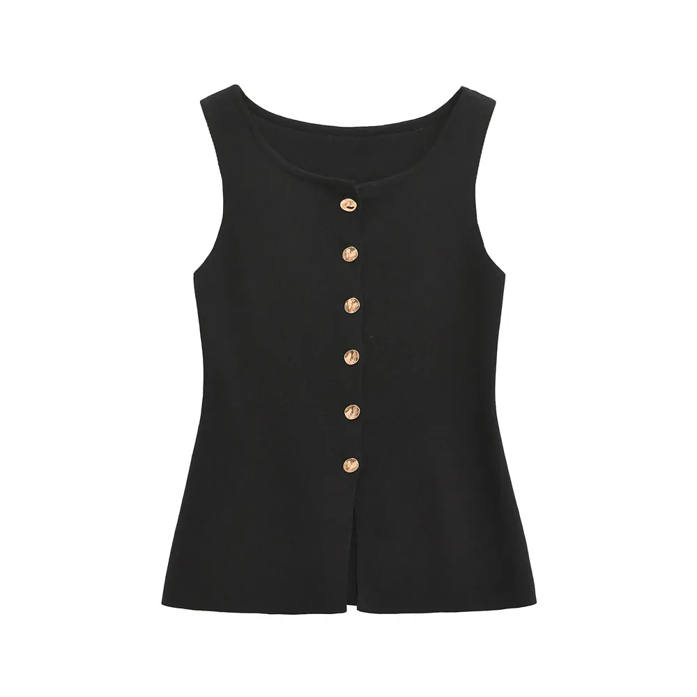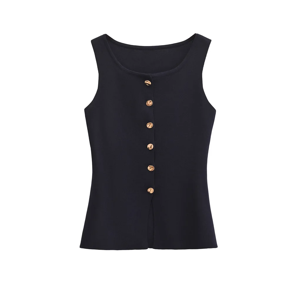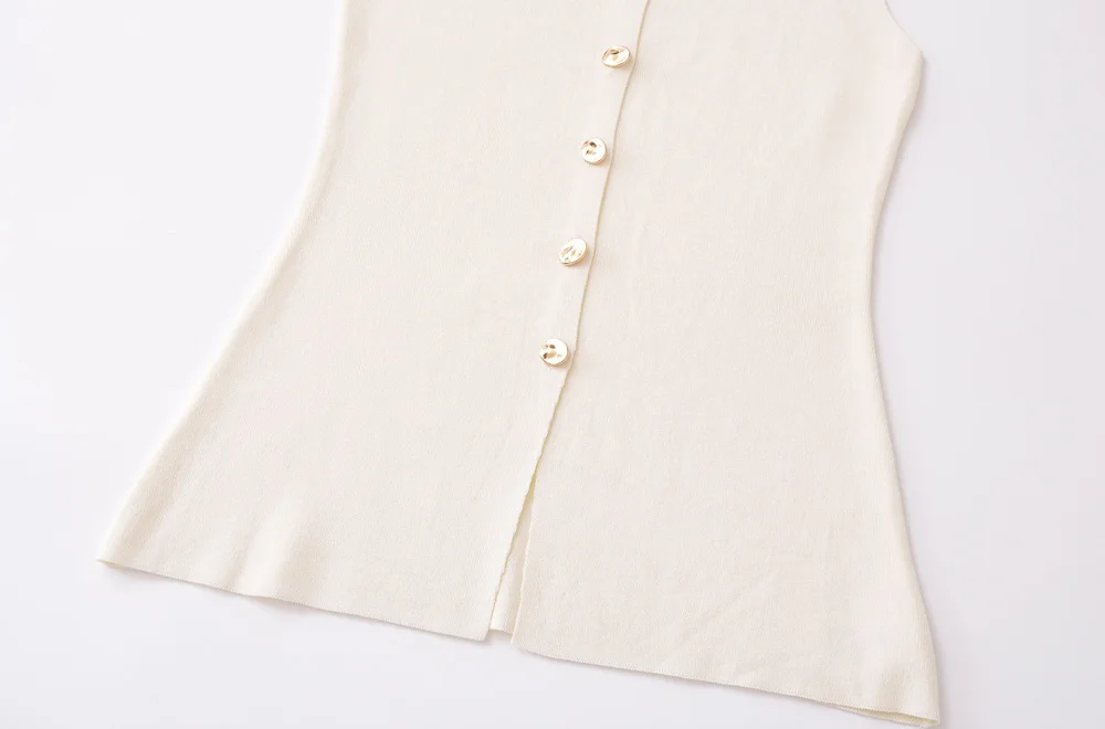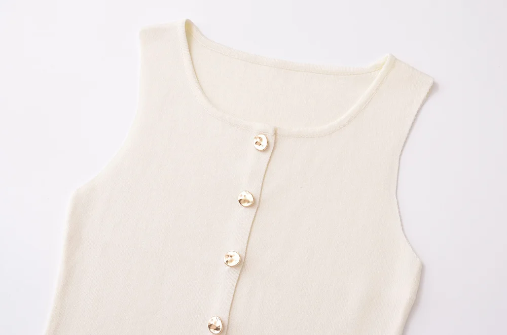 This elegant sleeveless knitted vest features stylish golden button detailing for a sophisticated layering piece. Perfect for all-season wear, this lightweight O-neck waistcoat adds a chic touch to any outfit while providing versatile styling options for both casual and professional looks.