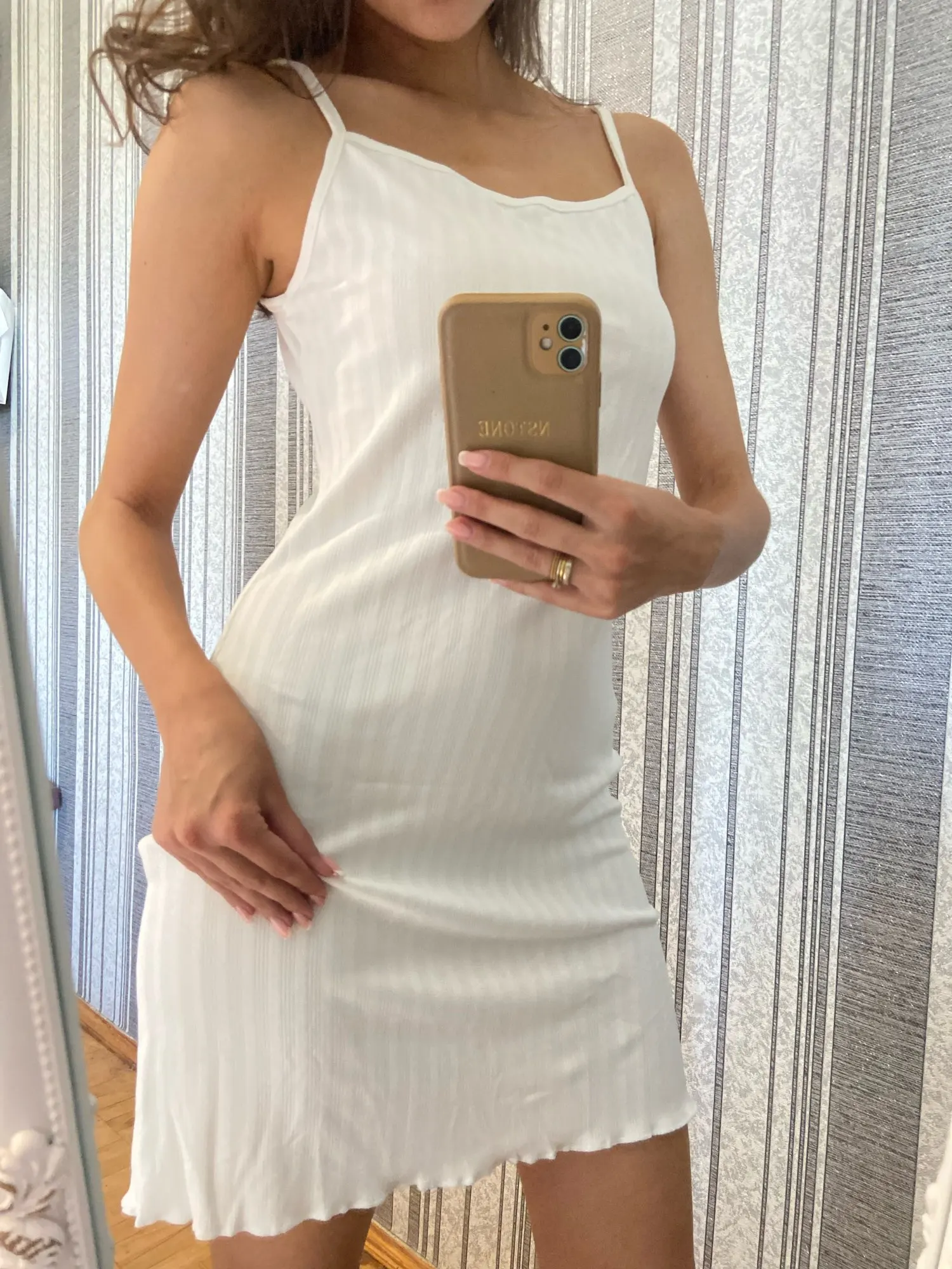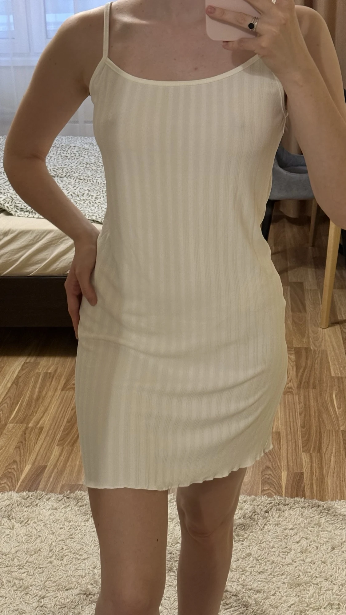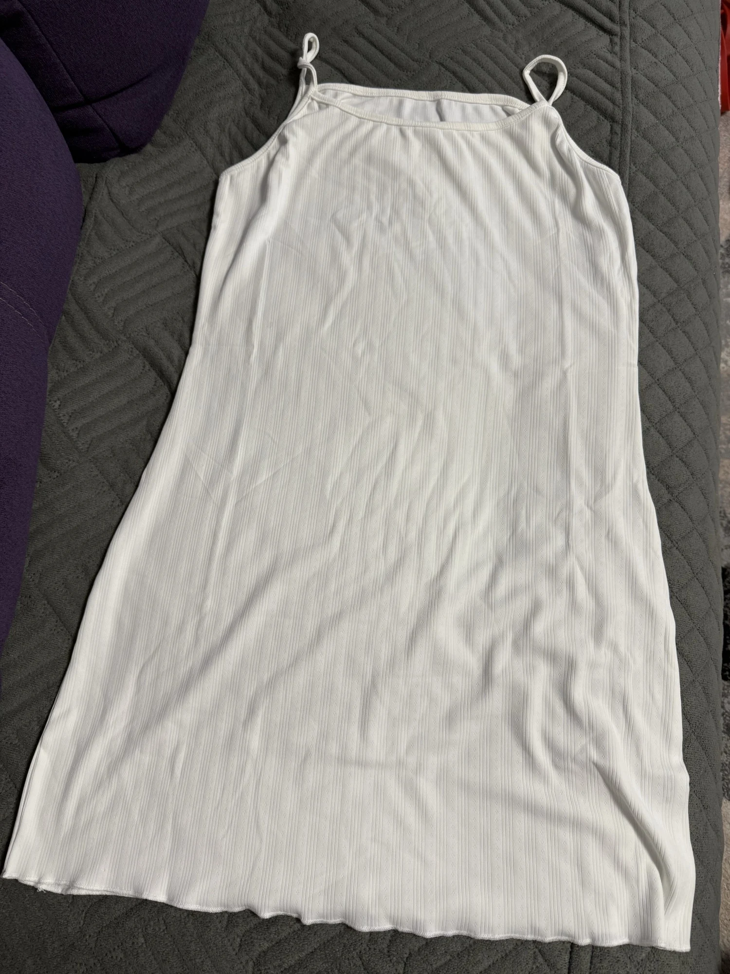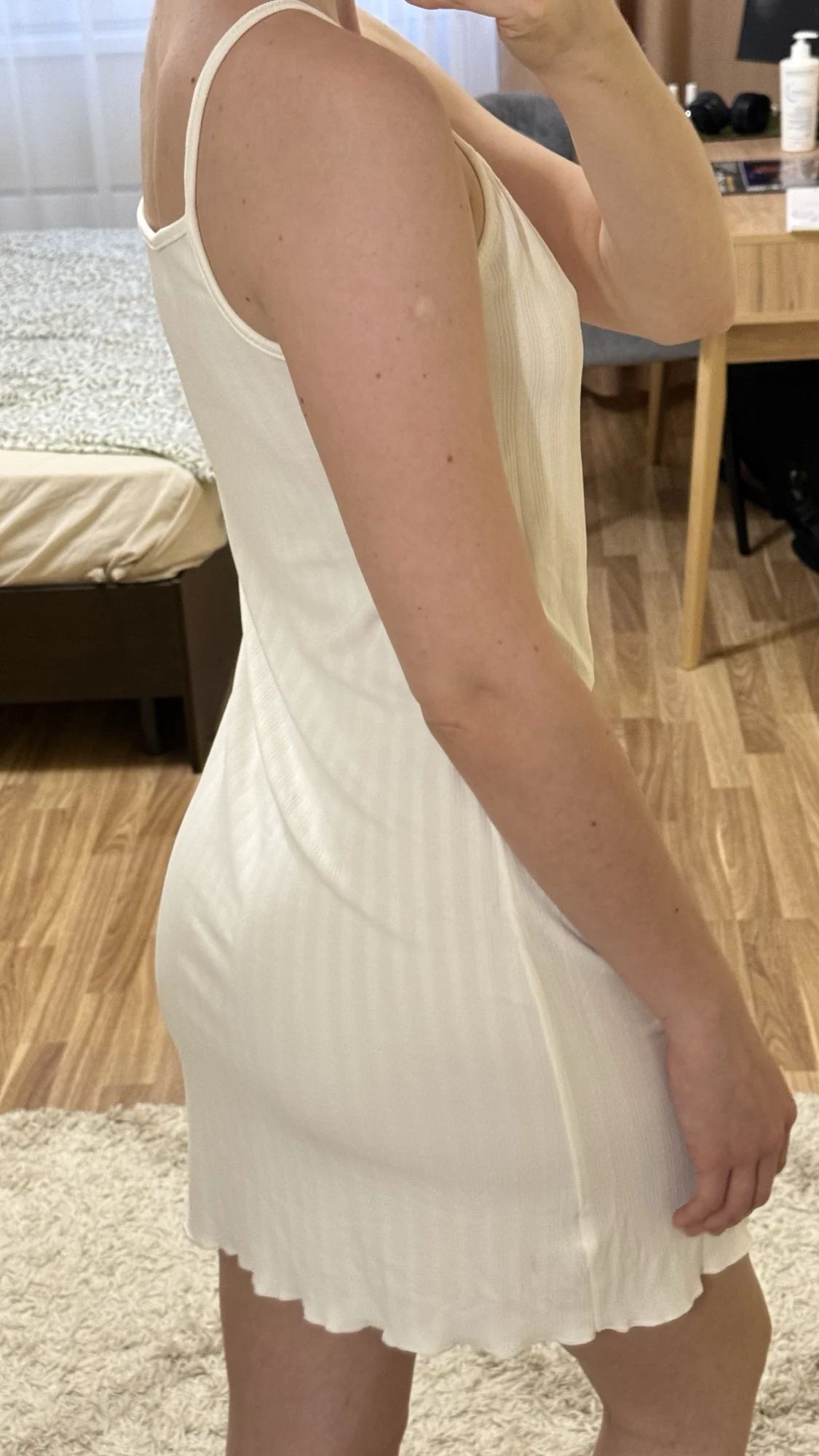 The knee-length cut flatters various body types and heights. Spaghetti straps adjust easily for a custom fit. The A-line silhouette creates a flowing, comfortable shape that moves with your body.