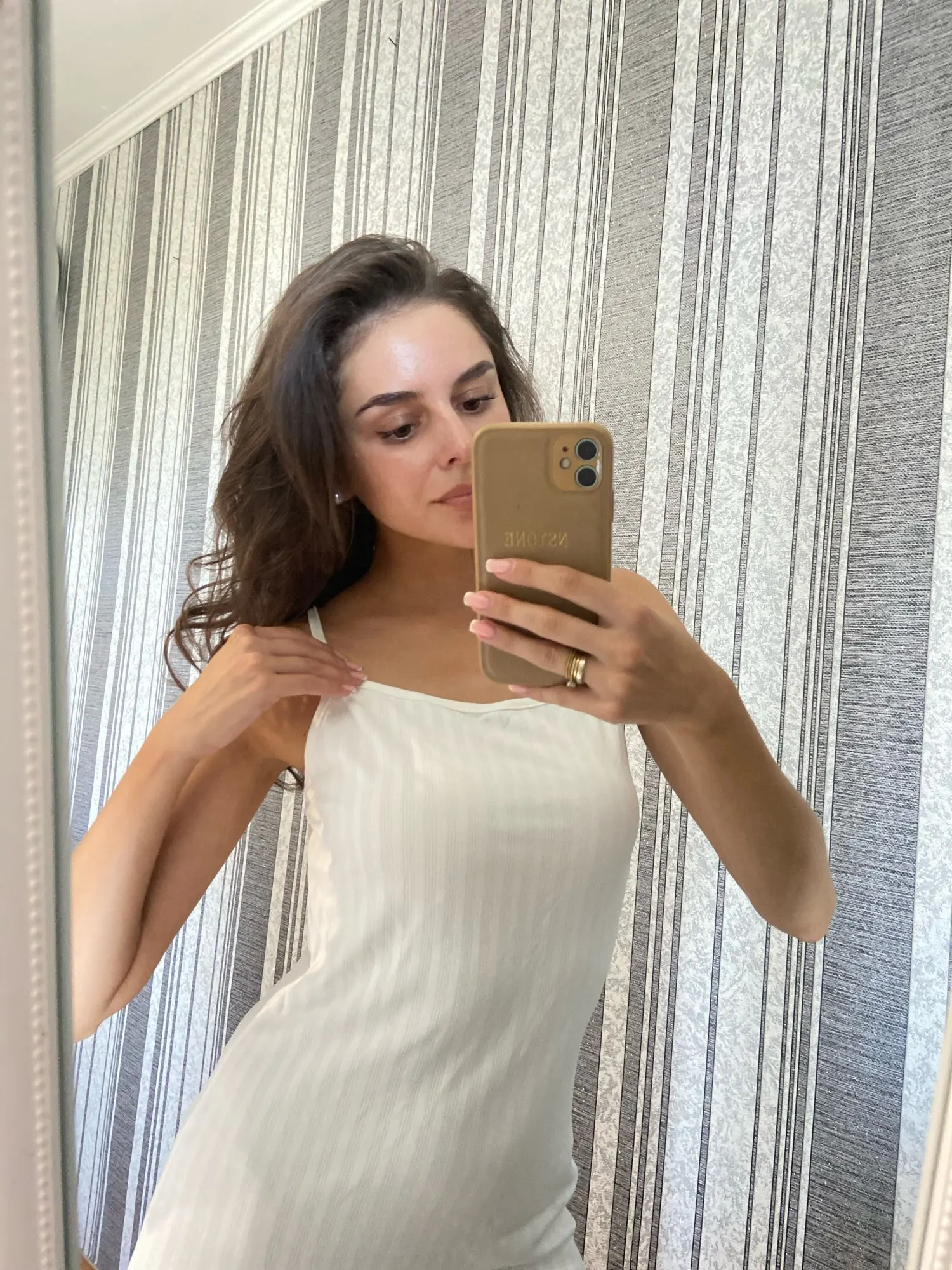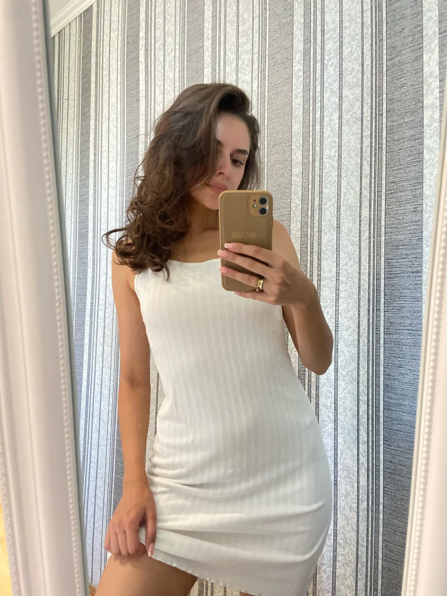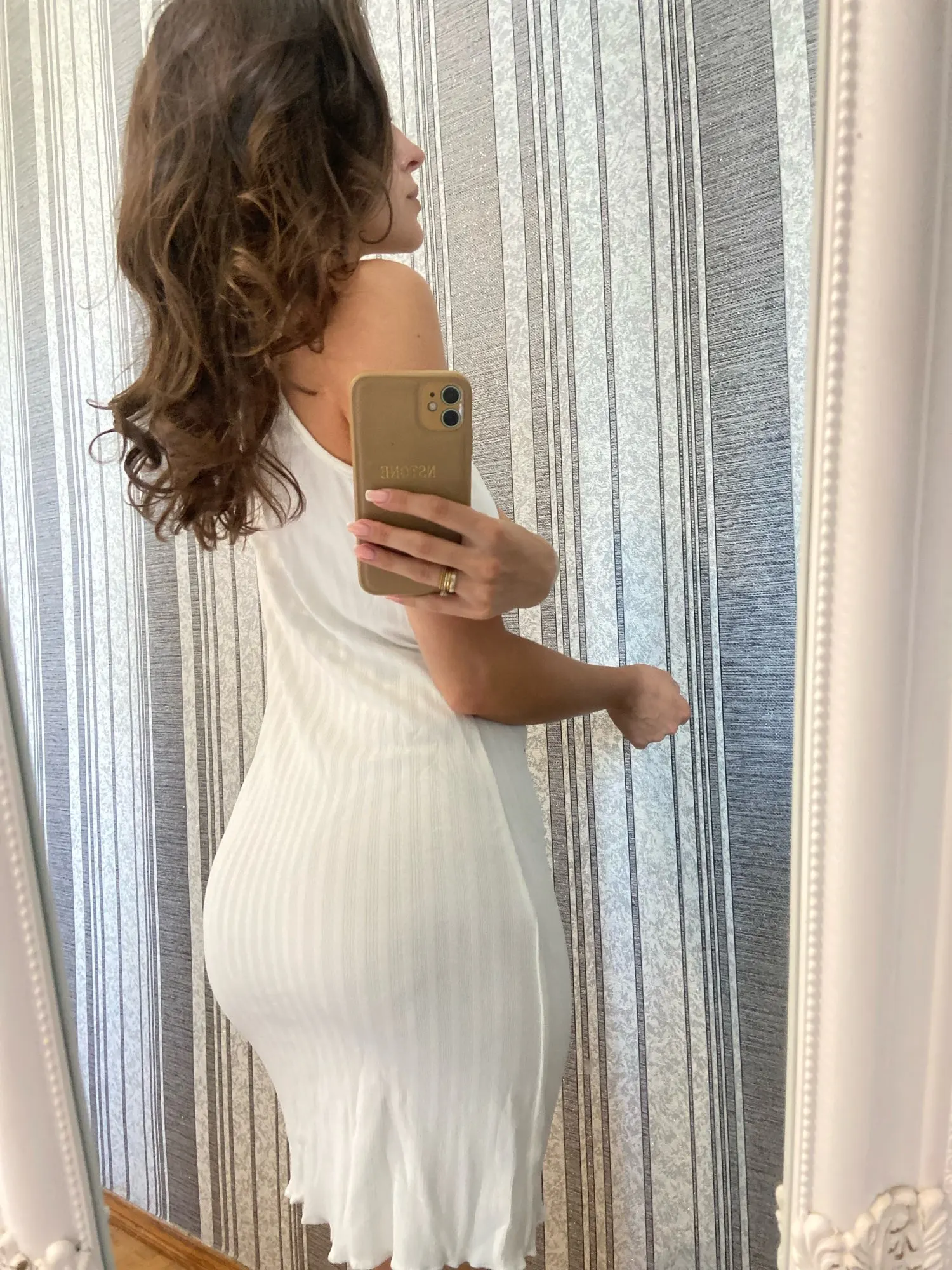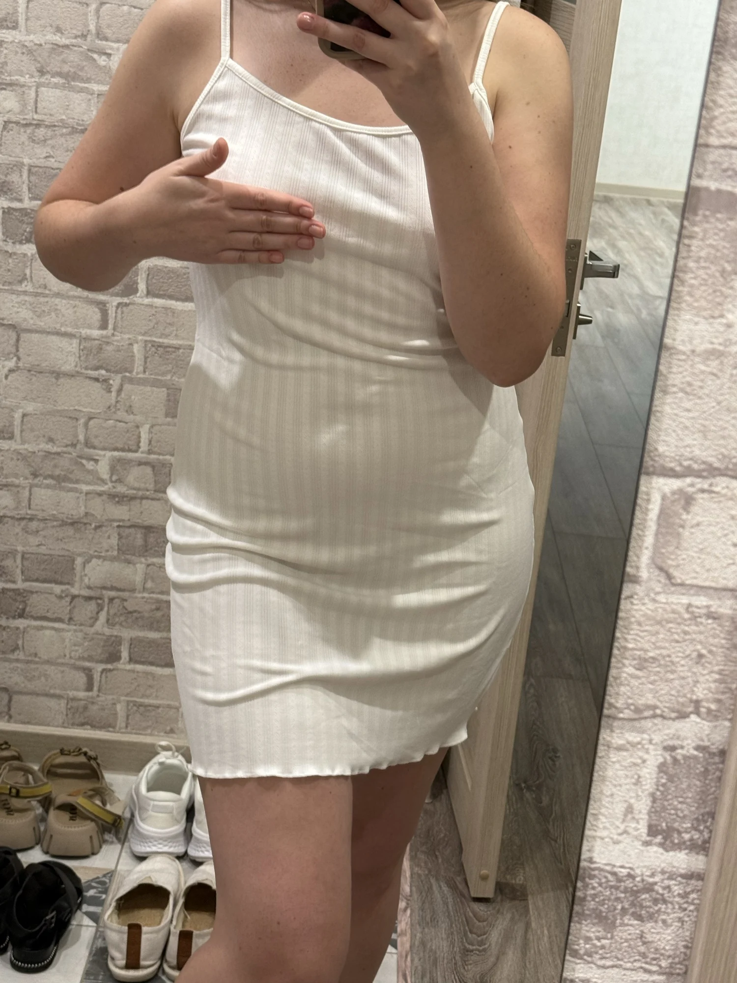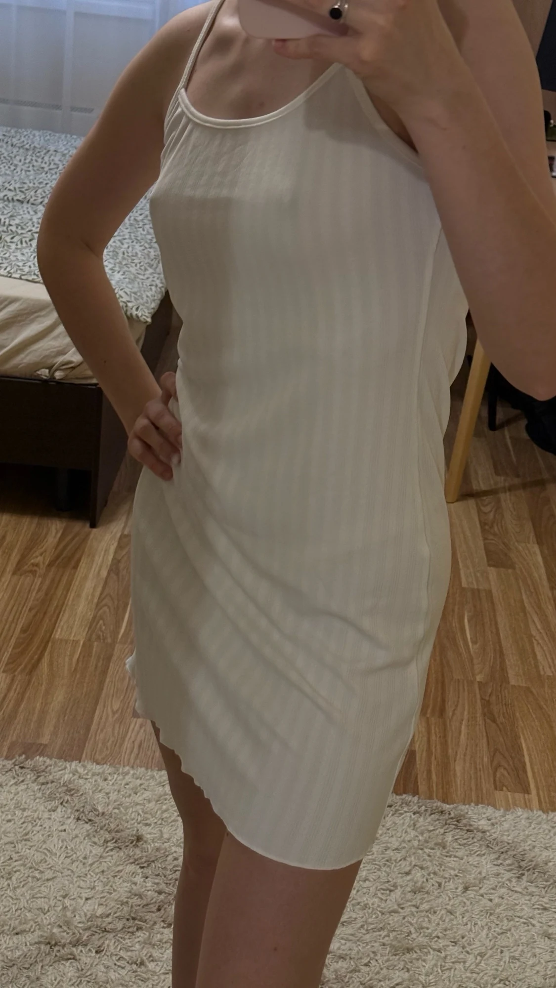 The knee-length cut flatters various body types and heights. Spaghetti straps adjust easily for a custom fit. The A-line silhouette creates a flowing, comfortable shape that moves with your body.
