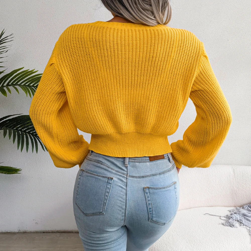 This fashionable knitted sweater perfectly captures the 2025 autumn/winter trends with its distinctive lantern sleeves and slim waist design, offering women a comfortable yet stylish option for casual everyday wear during cooler months.