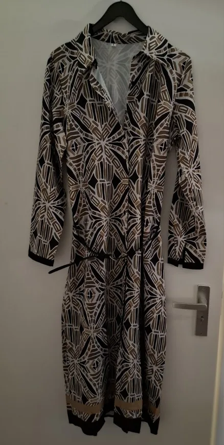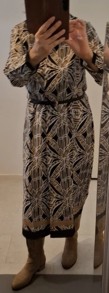 Elegant Geometric Print Midi Dress with Belt - Women's Long Sleeve A-Line Dress photo review