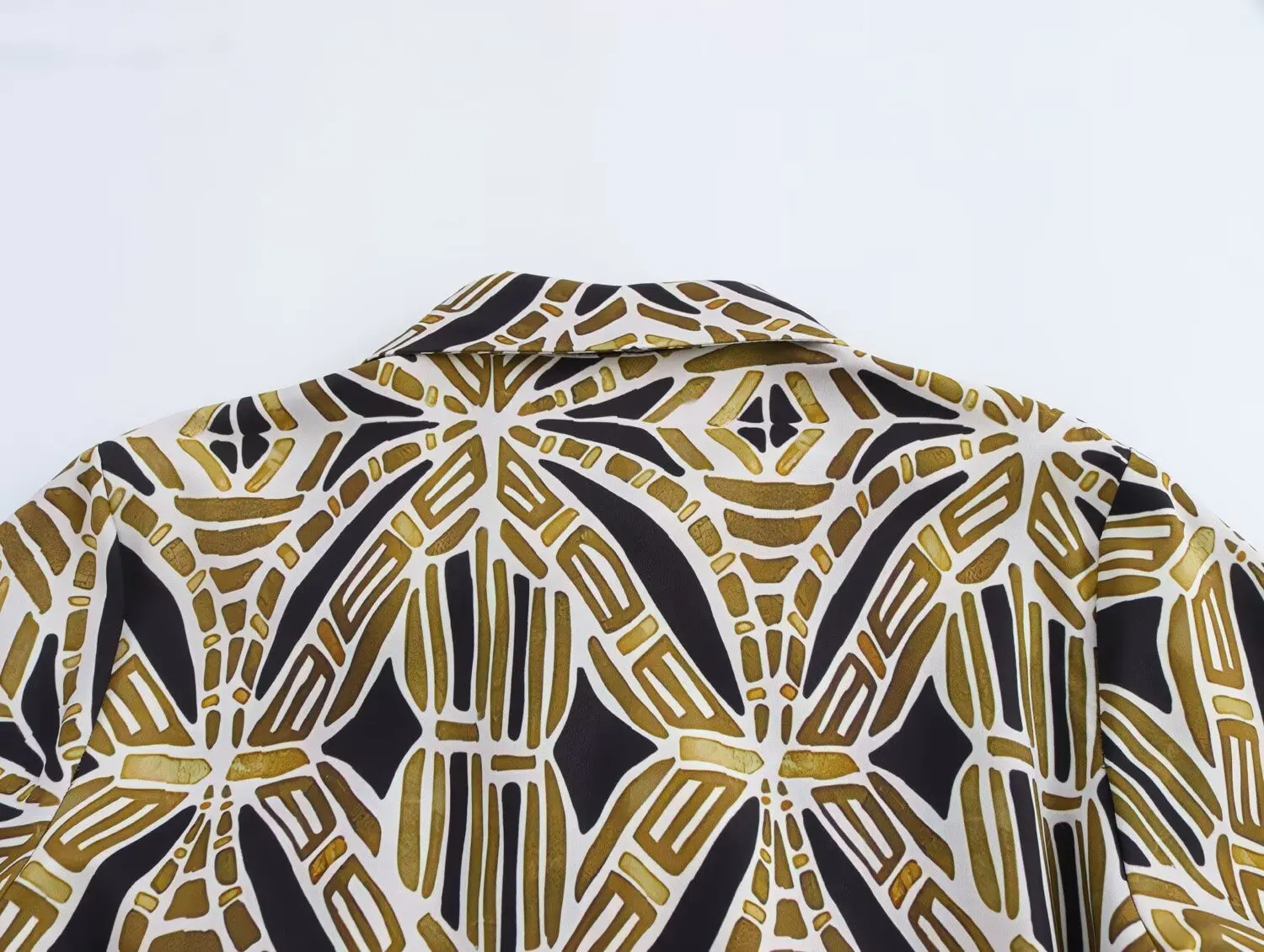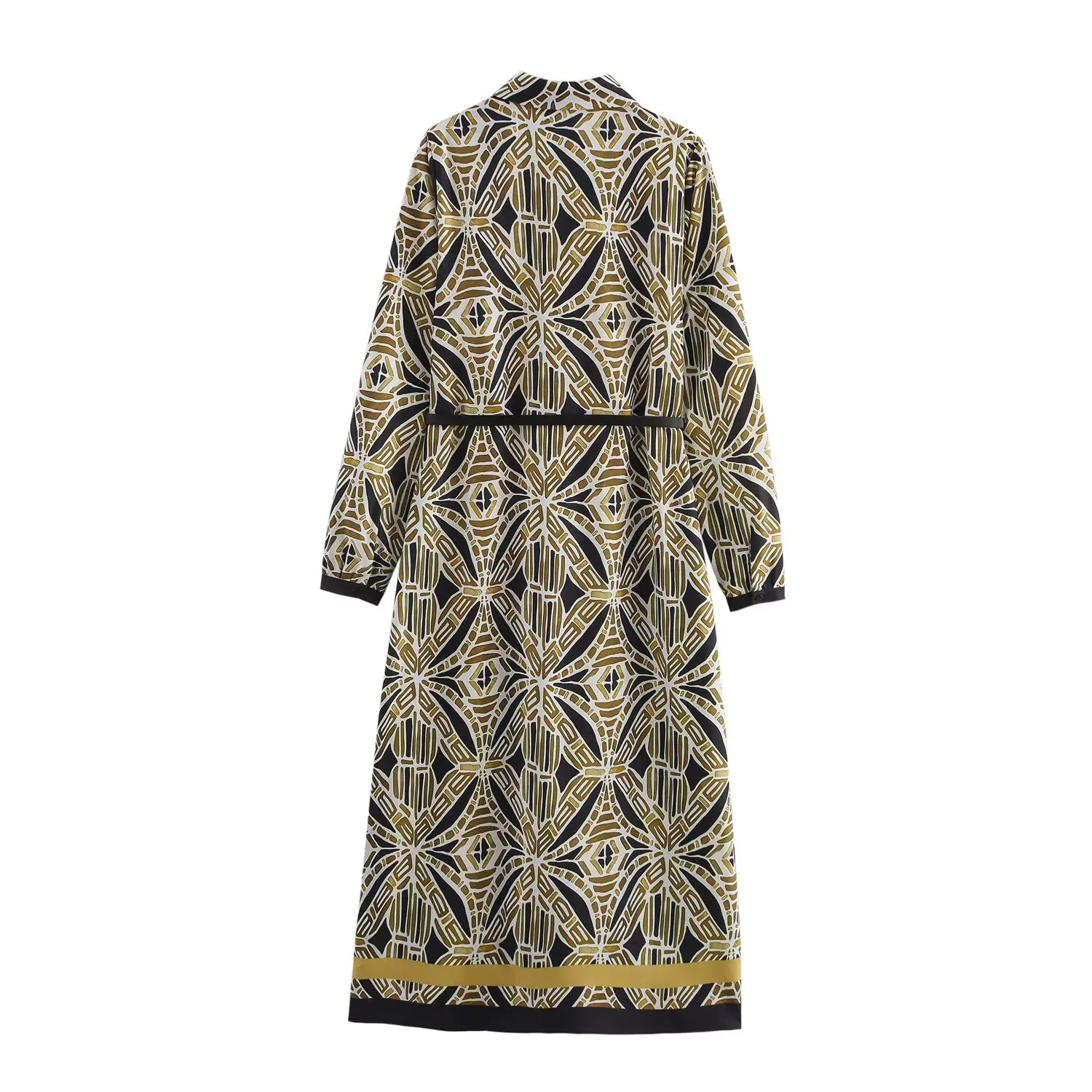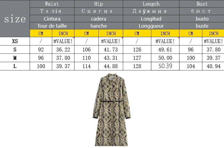 Elevate your wardrobe with this stunning geometric print midi dress, perfect for any season and occasion. This sophisticated A-line dress features a flattering mid-calf length and comes complete with a matching belt to accentuate your silhouette. The timeless turn-down collar and long sleeves create an elegant, professional look that transitions seamlessly from office to evening events.