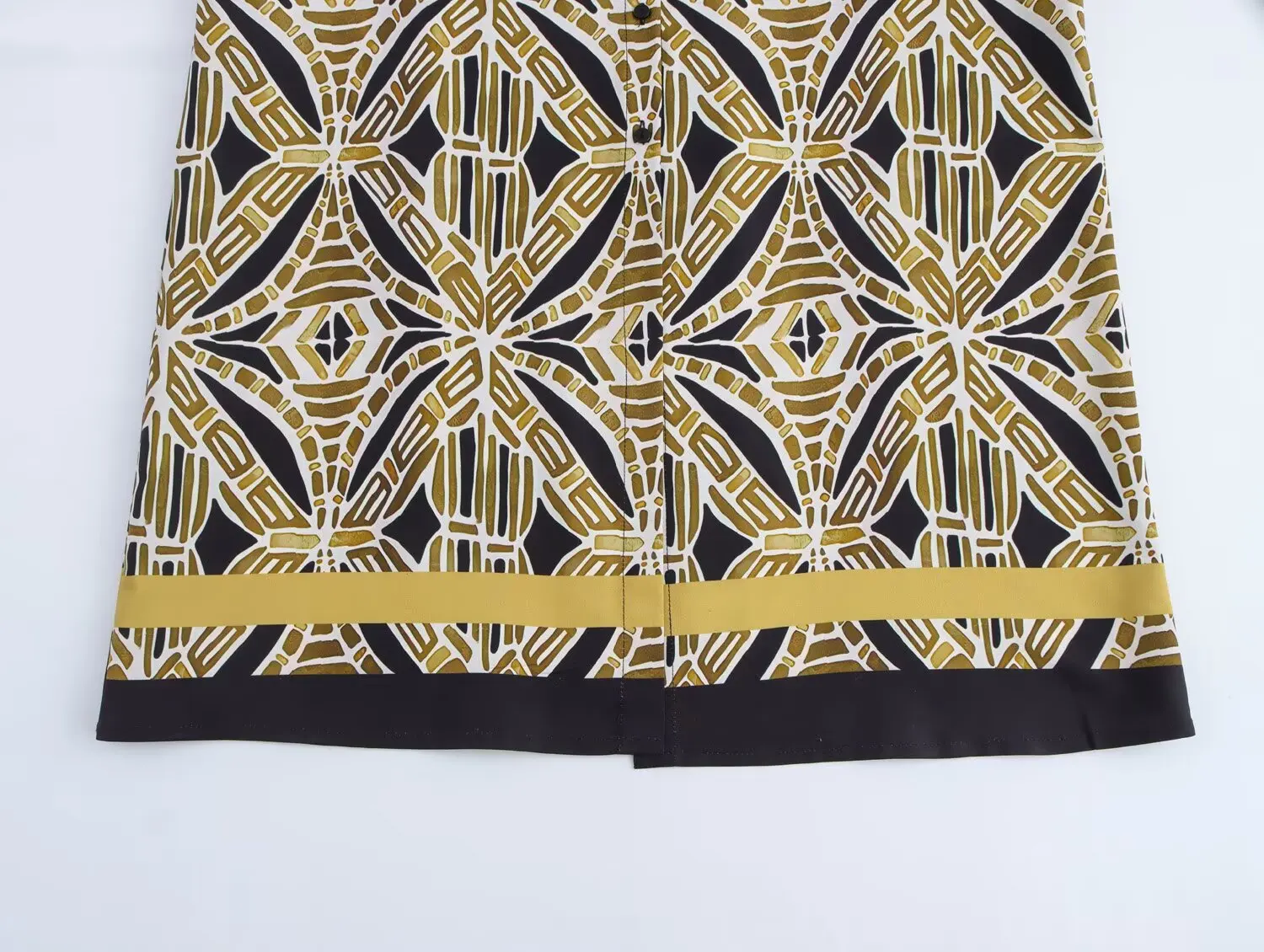 Crafted from high-quality polyester fabric, this dress offers both comfort and durability while maintaining its shape and vibrant print wash after wash. The geometric pattern adds a modern, artistic touch to the classic design, making it a versatile piece that can be dressed up or down depending on the occasion.