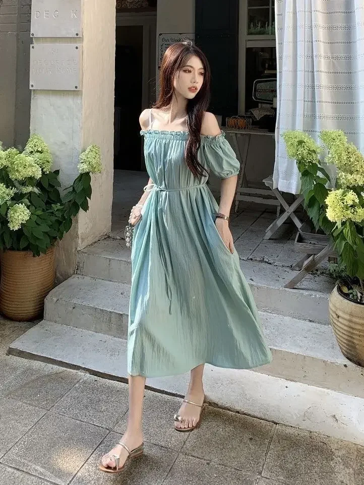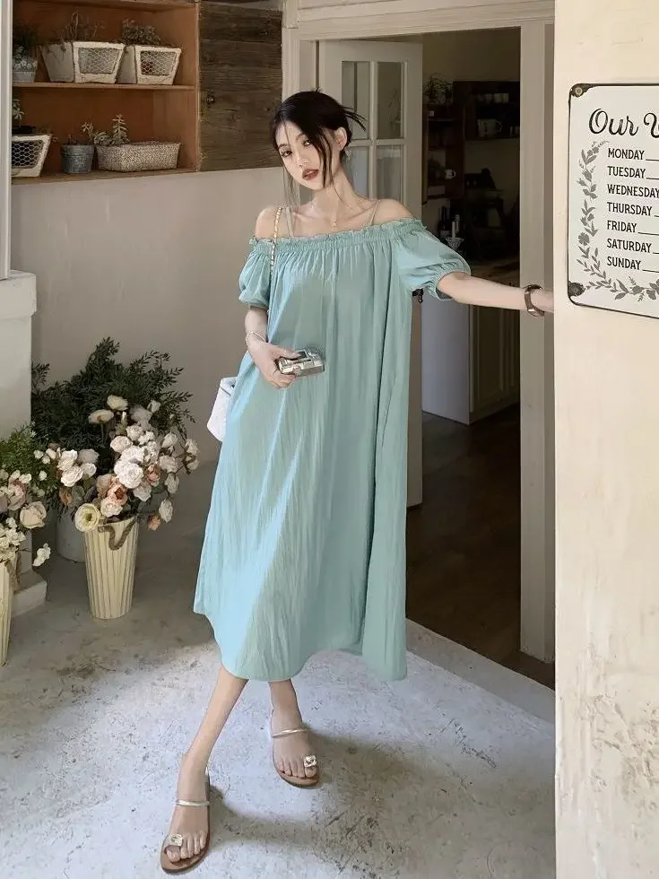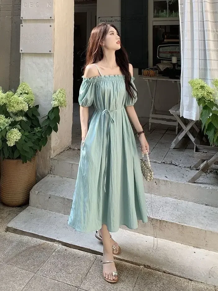 • Versatile Off-Shoulder Design: Romantic spaghetti strap style with slash neckline
