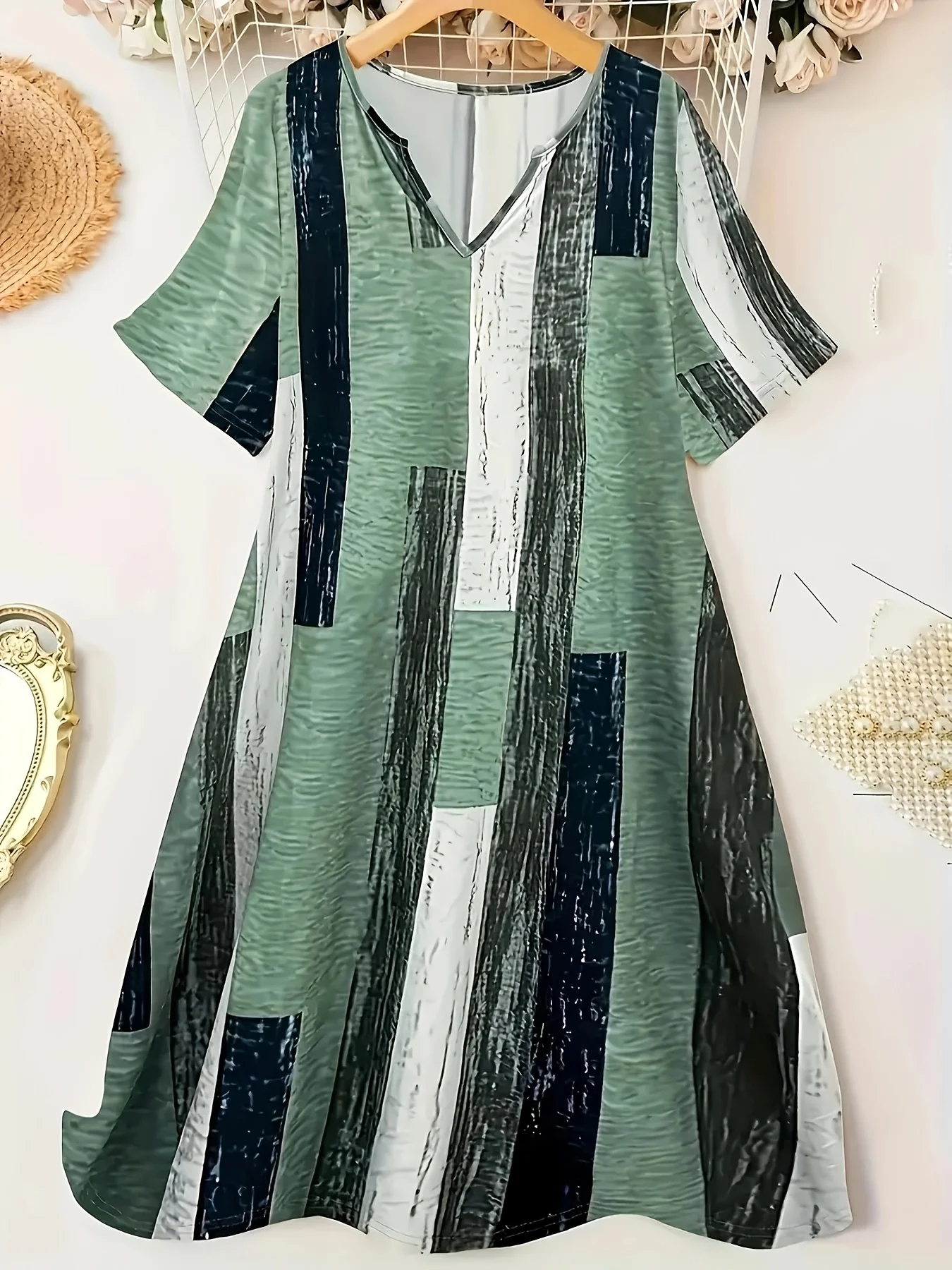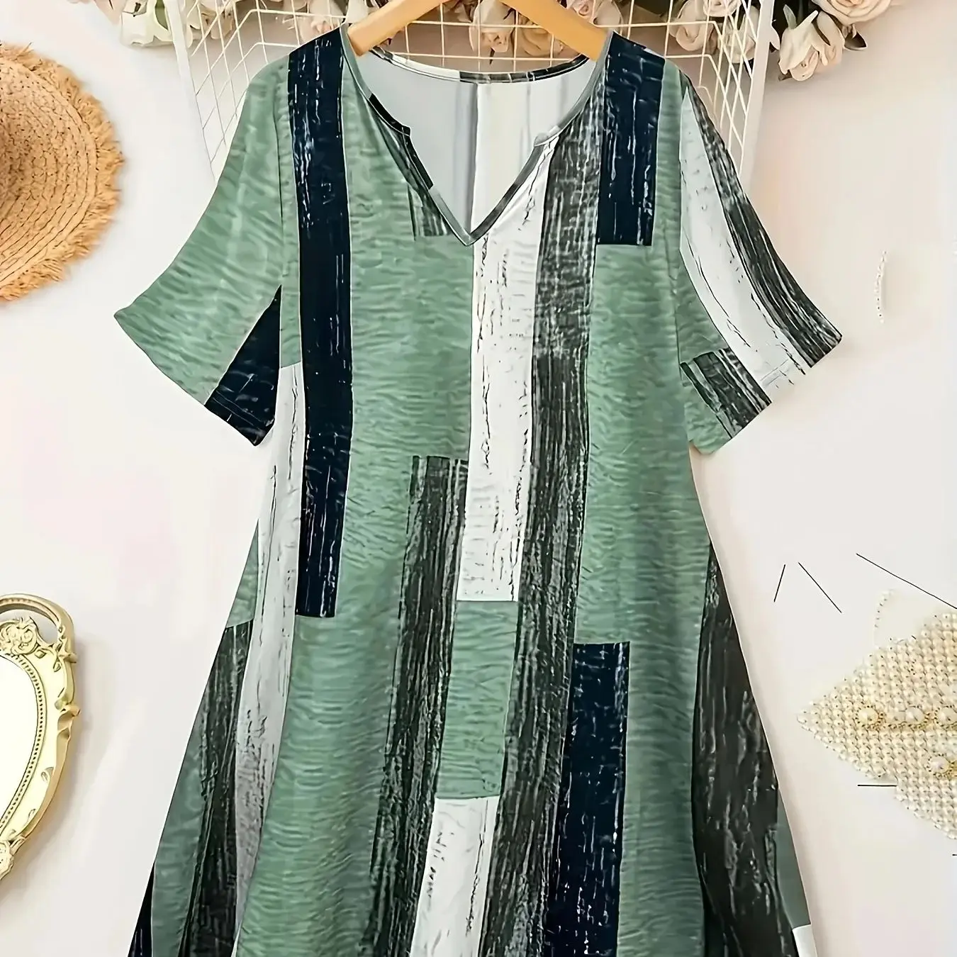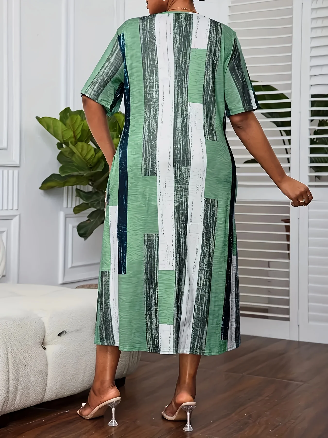 Comfortable plus-size casual dress featuring a flattering V-neckline and contrasting stripe pattern. Made from soft polyester knit fabric with a relaxed straight-cut silhouette that provides all-day comfort. Perfect for everyday wear during spring and summer seasons.