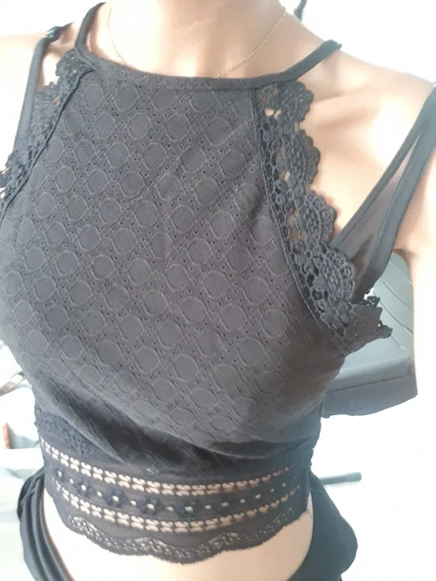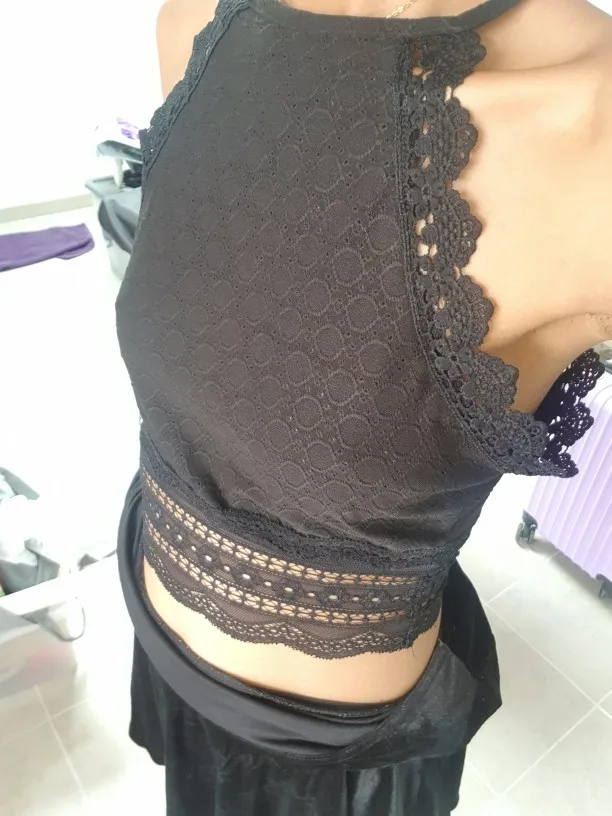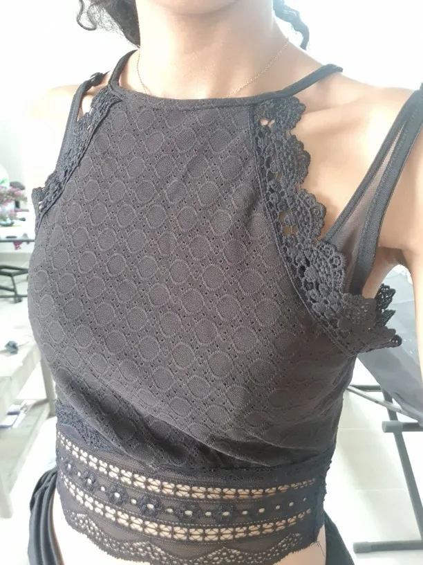 The halter neckline creates a flattering silhouette while the cropped length offers a modern, on-trend look perfect for layering or wearing solo. Crafted from a comfortable polyester-spandex blend with delicate lace detailing, this top provides the perfect balance of structure and stretch for all-day comfort.