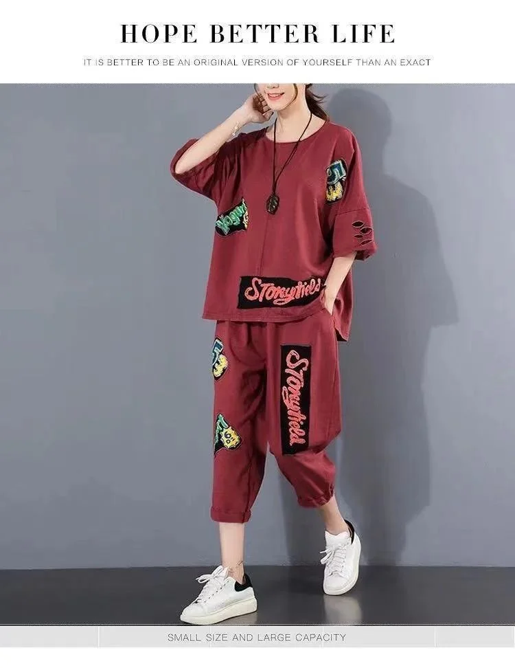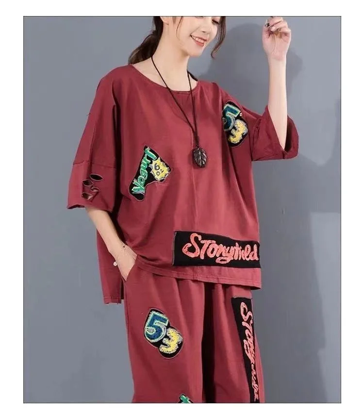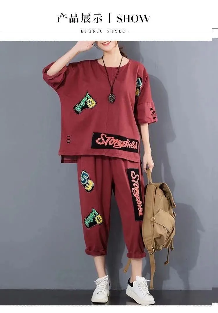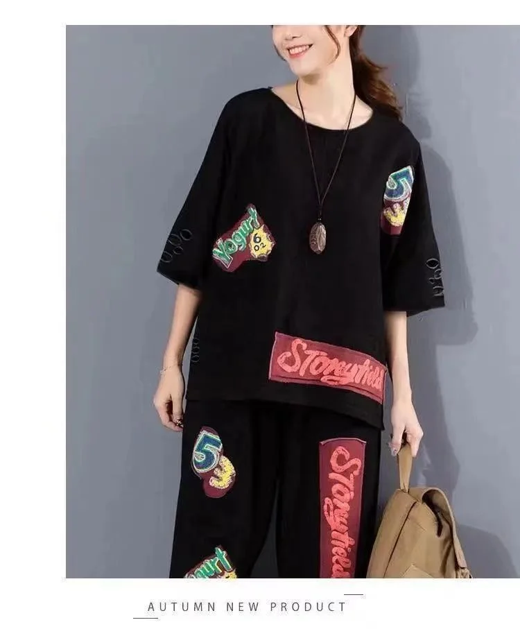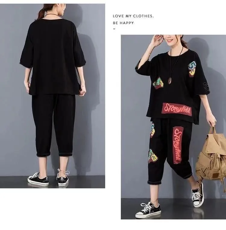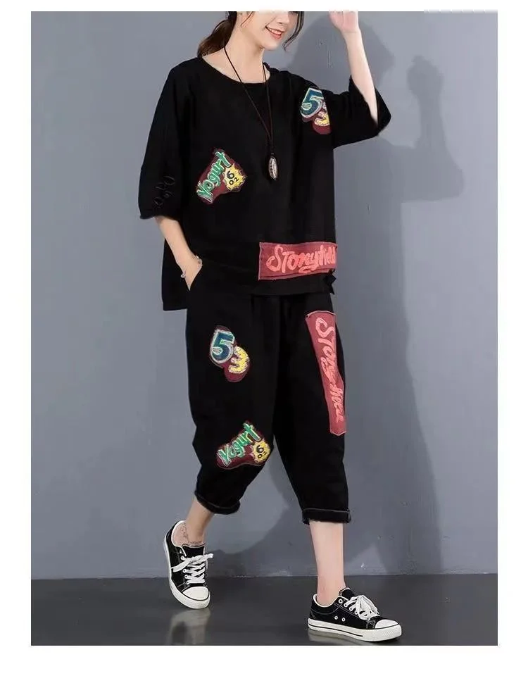 A comfortable 2025 summer collection featuring a loose-fit short sleeve crop top paired with calf-length harem pants. This knit polyester-cotton blend set offers medium stretch with decorative patchwork and print patterns. The drawstring waist and pullover design provide both style and comfort for casual summer wear.