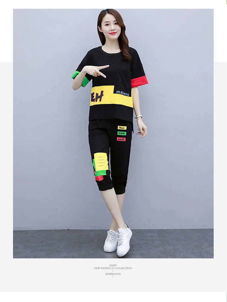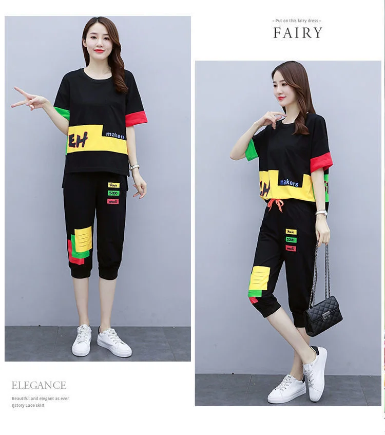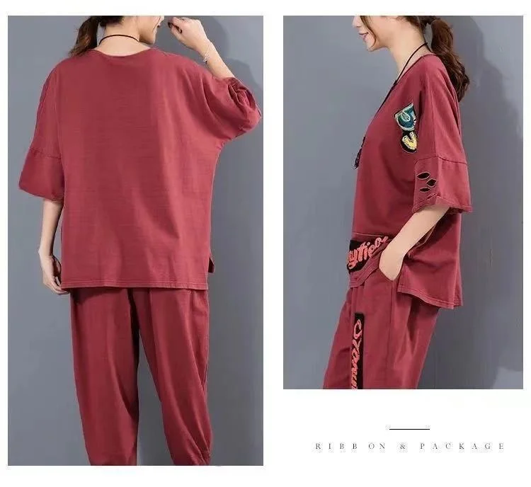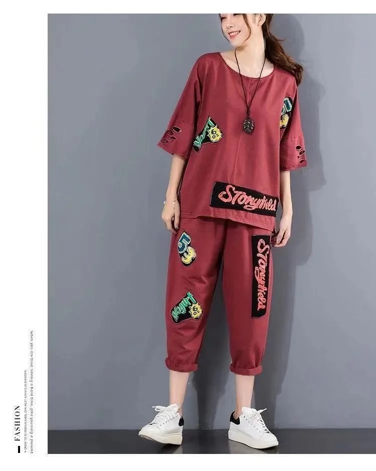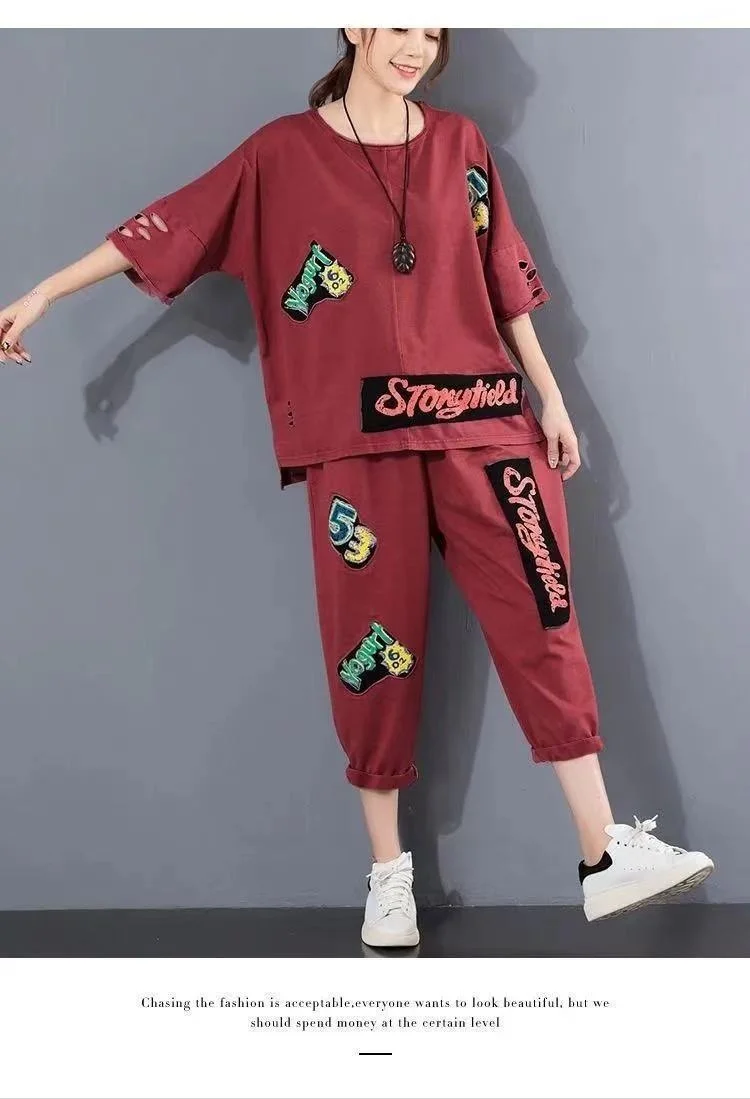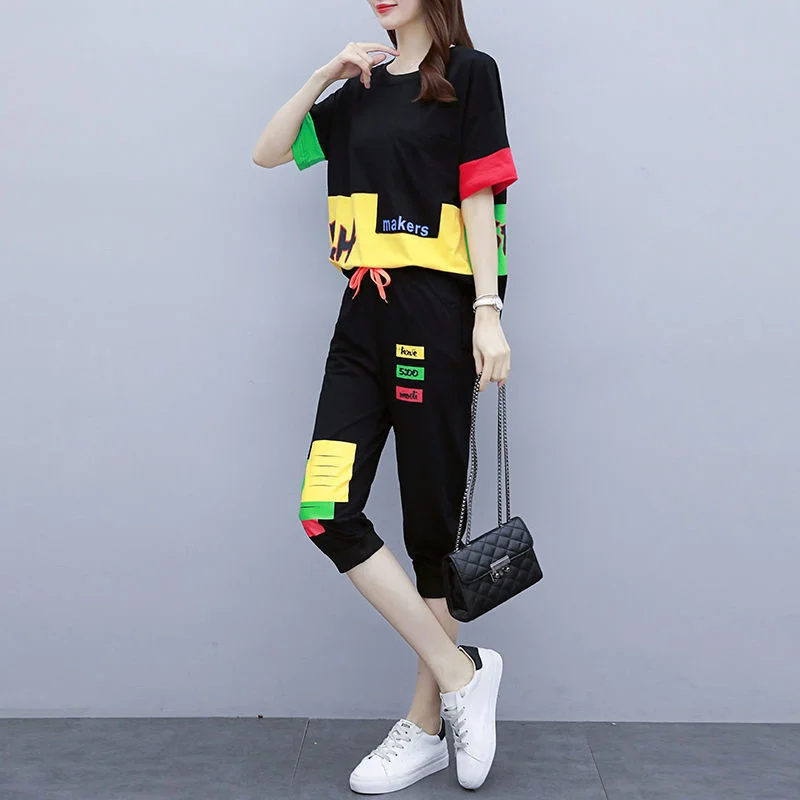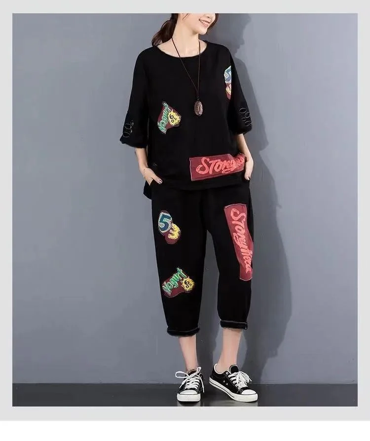 A comfortable 2025 summer collection featuring a loose-fit short sleeve crop top paired with calf-length harem pants. This knit polyester-cotton blend set offers medium stretch with decorative patchwork and print patterns. The drawstring waist and pullover design provide both style and comfort for casual summer wear.