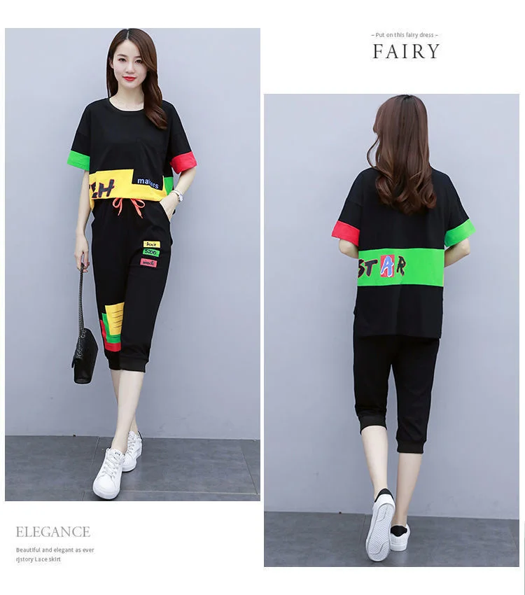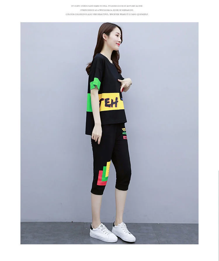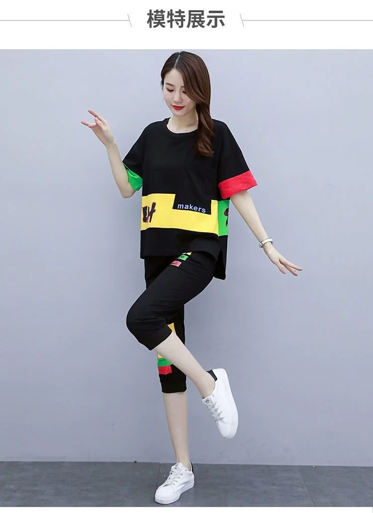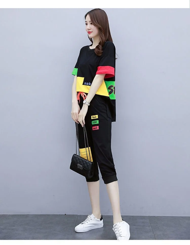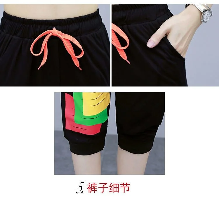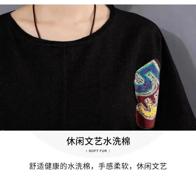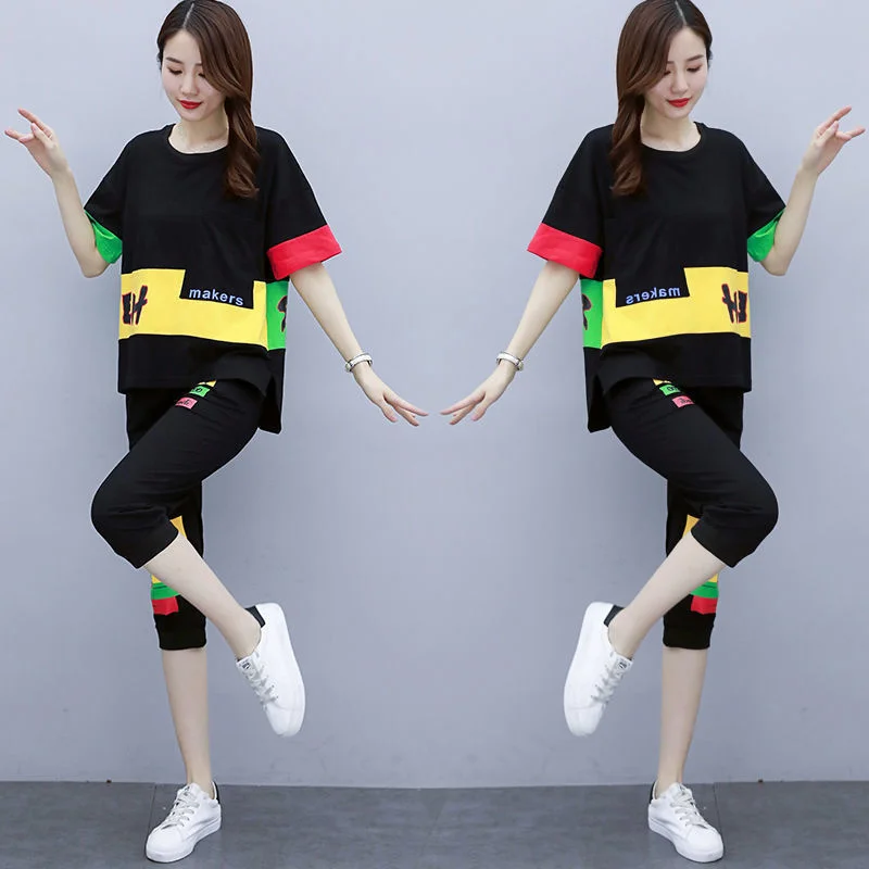 A comfortable 2025 summer collection featuring a loose-fit short sleeve crop top paired with calf-length harem pants. This knit polyester-cotton blend set offers medium stretch with decorative patchwork and print patterns. The drawstring waist and pullover design provide both style and comfort for casual summer wear.