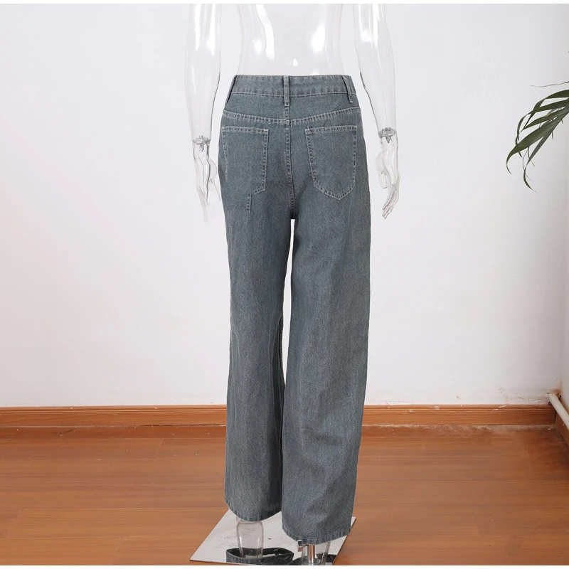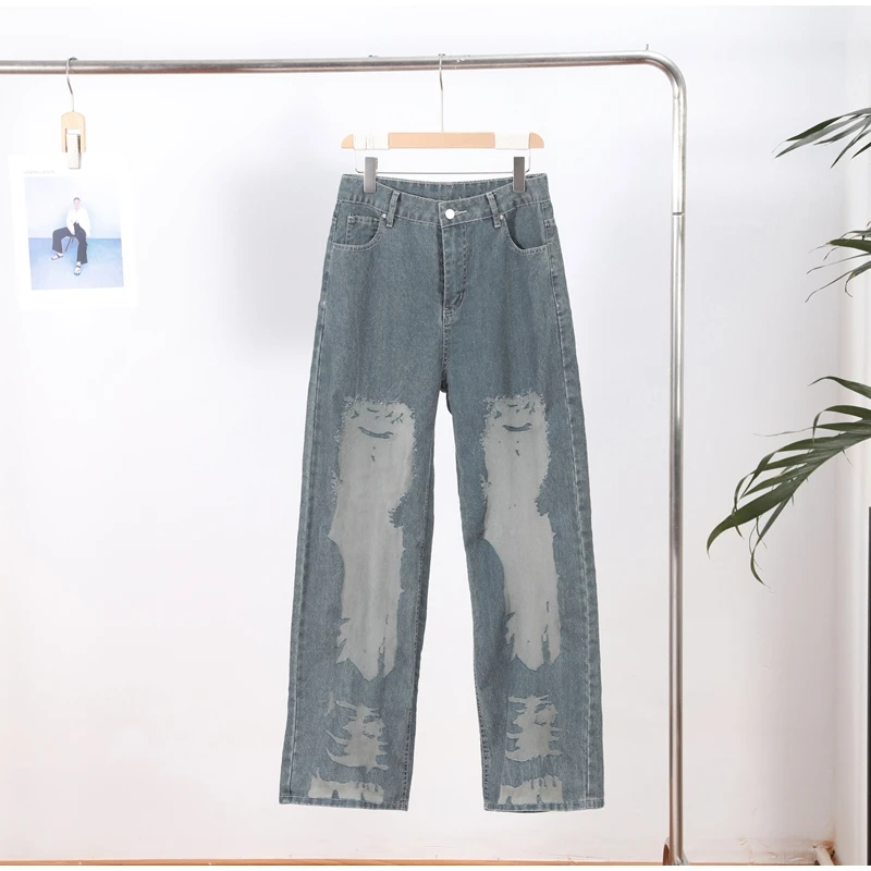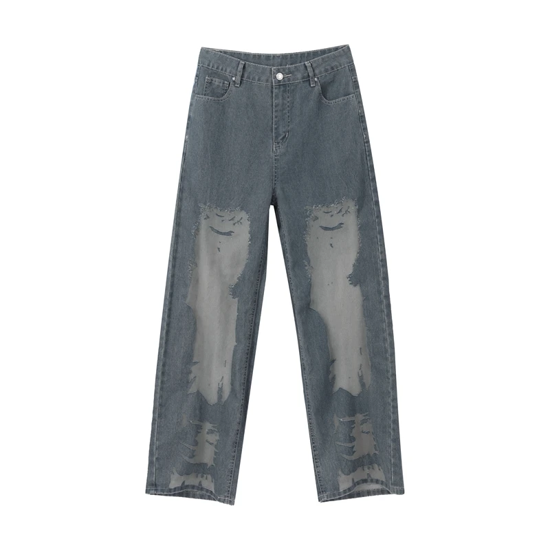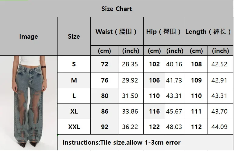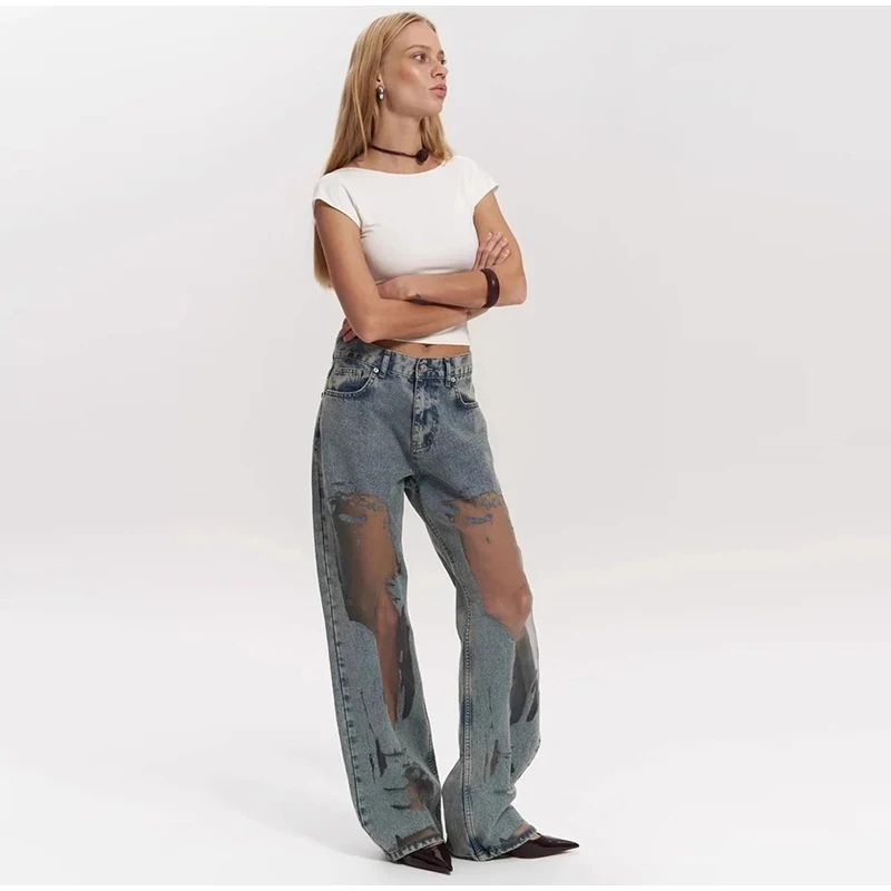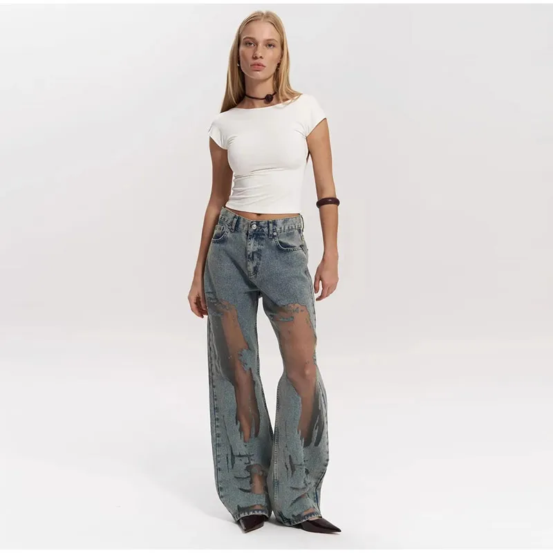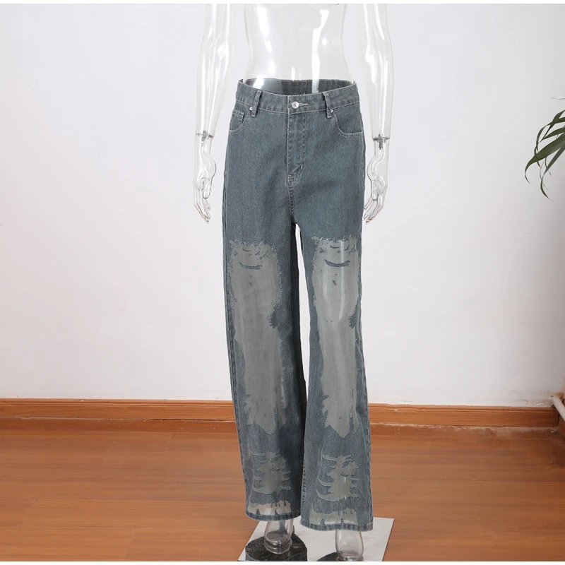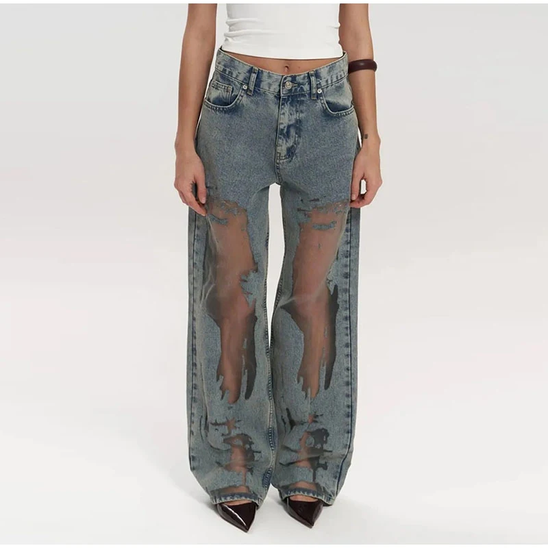 Bold Y2K-inspired wide leg jeans featuring striking see-through mesh panels and patchwork denim design. Perfect for making a statement with high street fashion. The baggy silhouette combines vintage aesthetics with modern streetwear edge for a unique summer look.