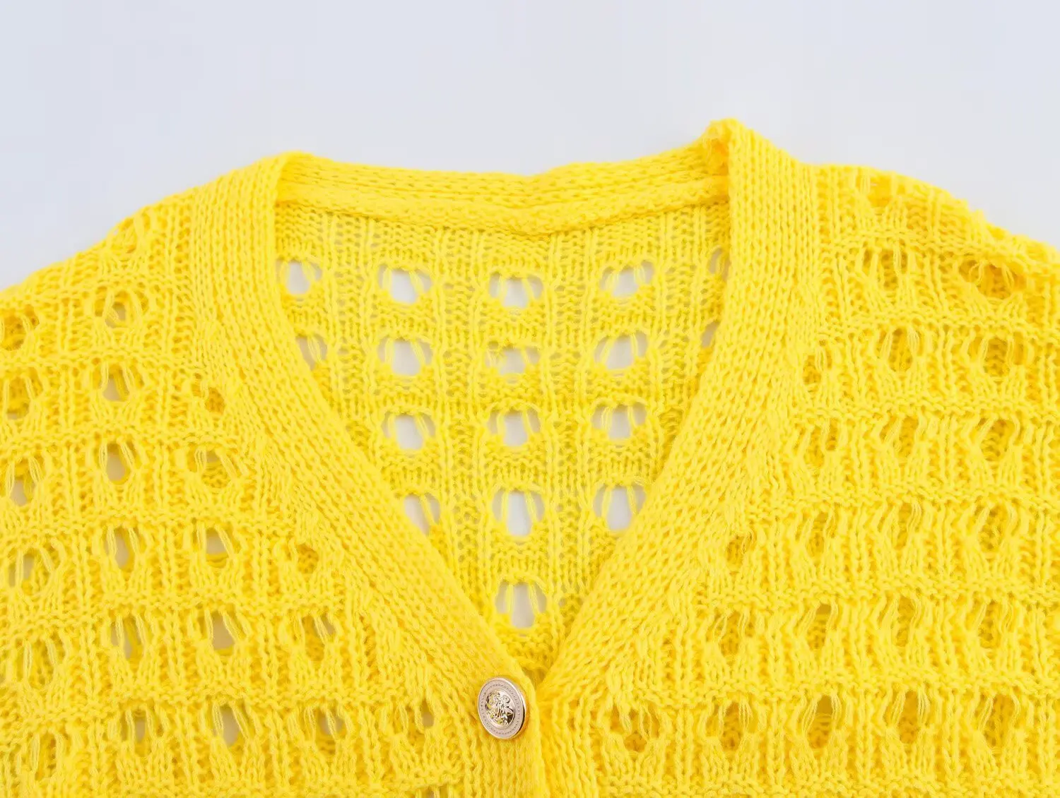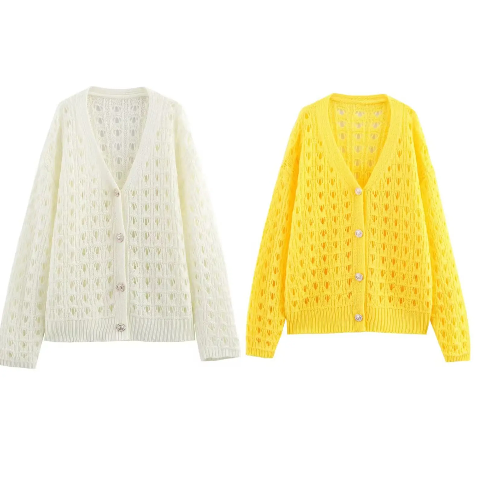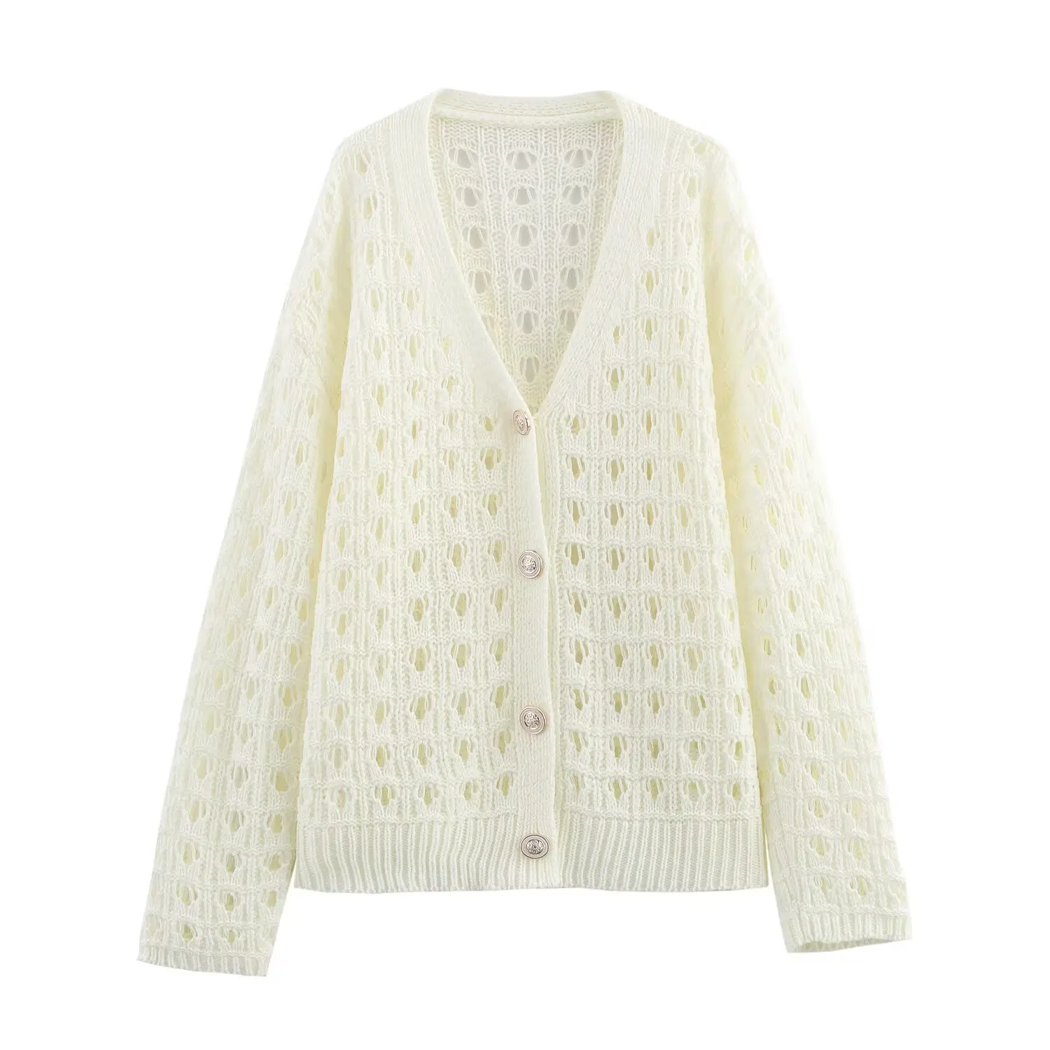 This stylish hollow knitted cardigan features a flattering V-neck design and loose hem styling perfect for spring and summer layering. The single-breasted closure and regular fit construction create a versatile casual chic jacket ideal for transitional weather and effortless everyday styling.