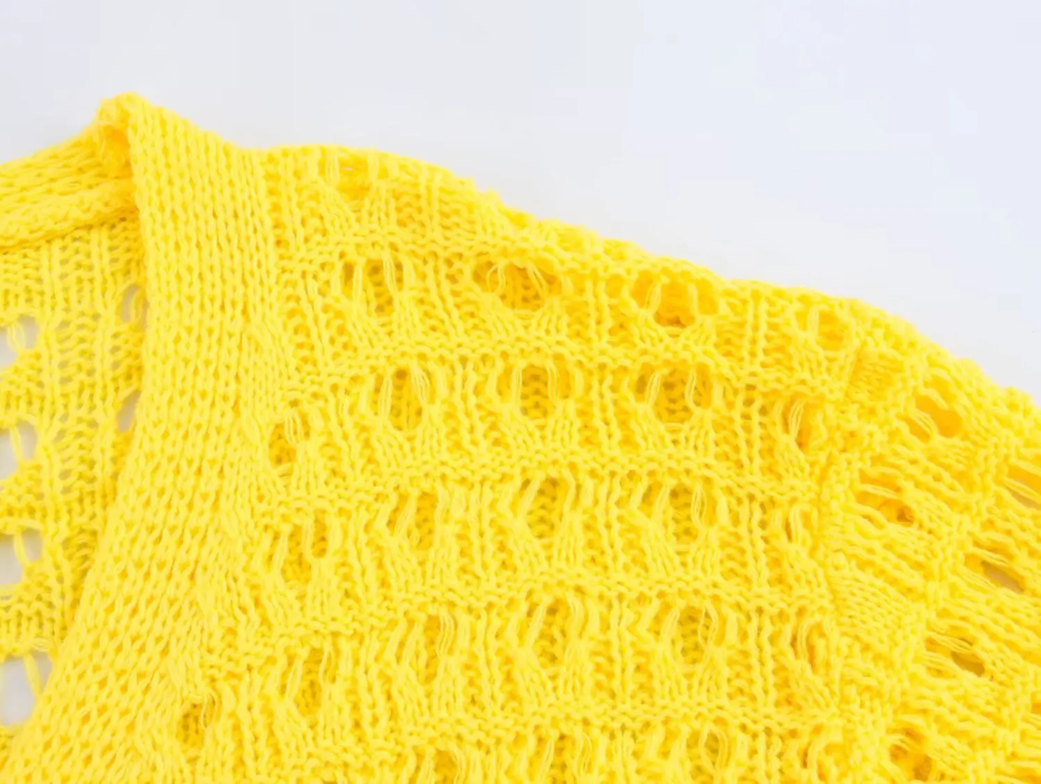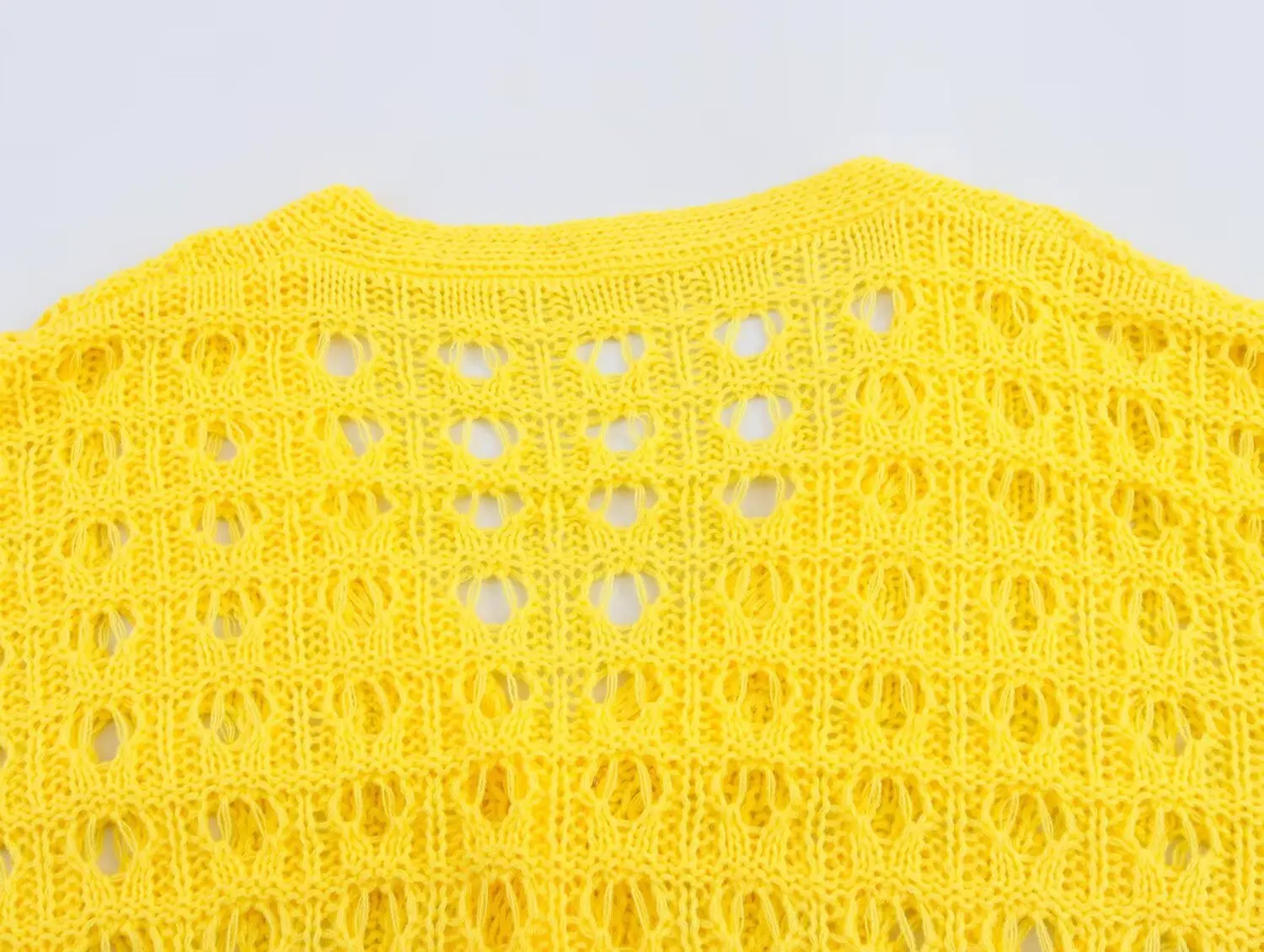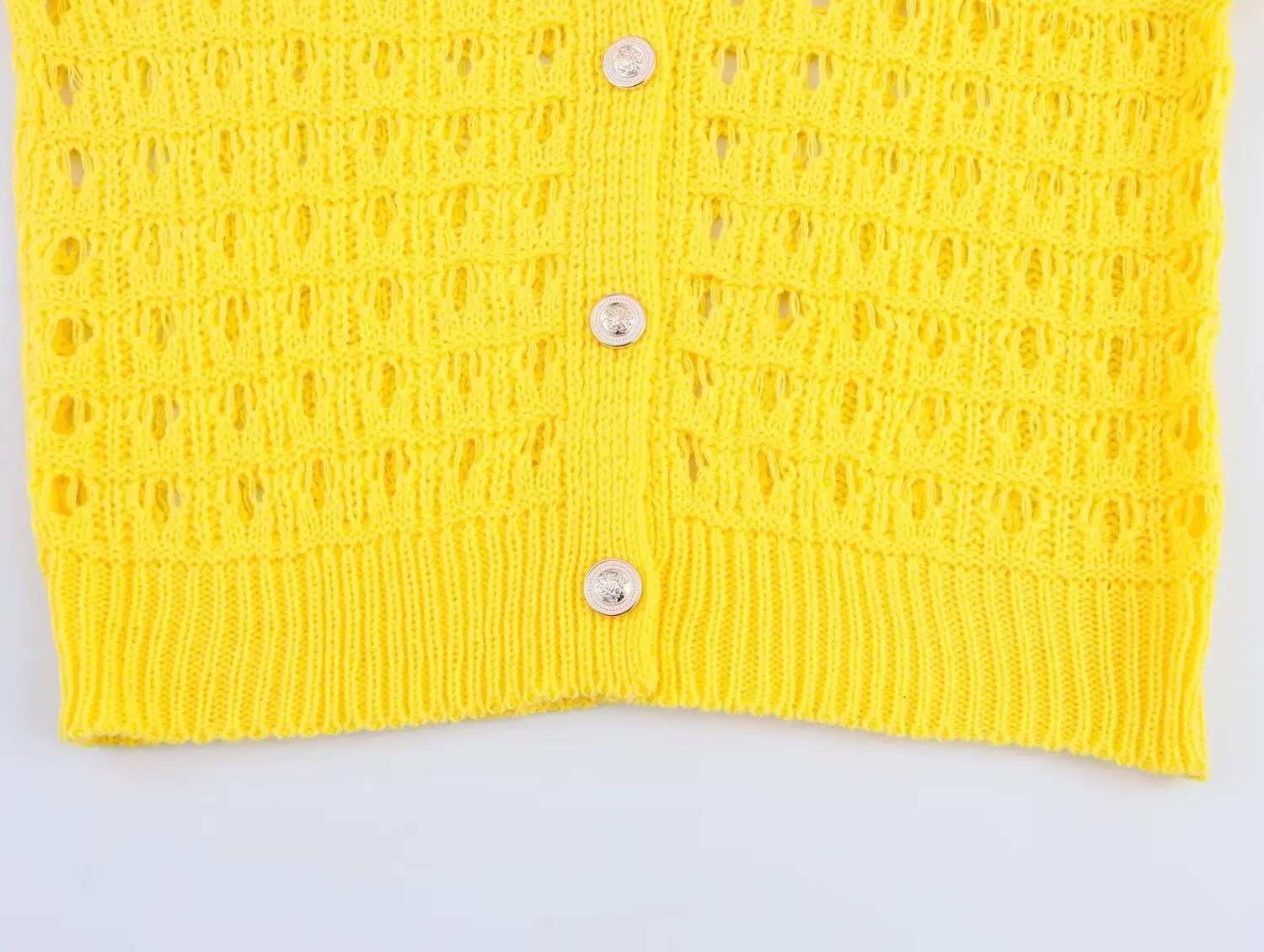 This stylish hollow knitted cardigan features a flattering V-neck design and loose hem styling perfect for spring and summer layering. The single-breasted closure and regular fit construction create a versatile casual chic jacket ideal for transitional weather and effortless everyday styling.